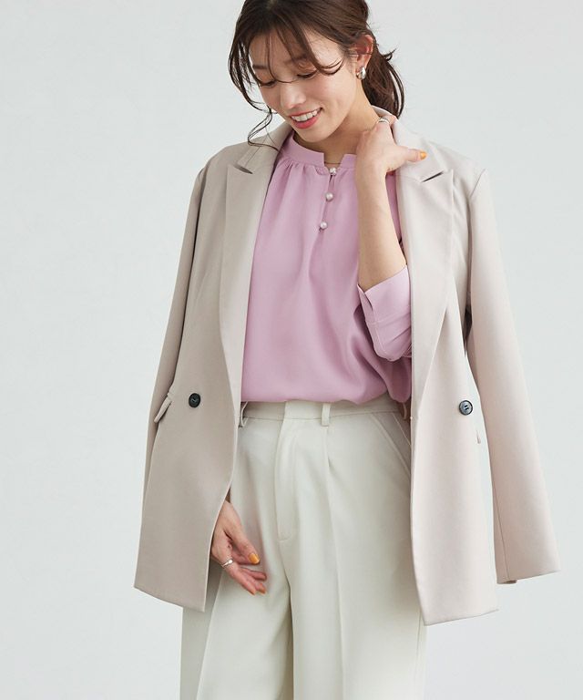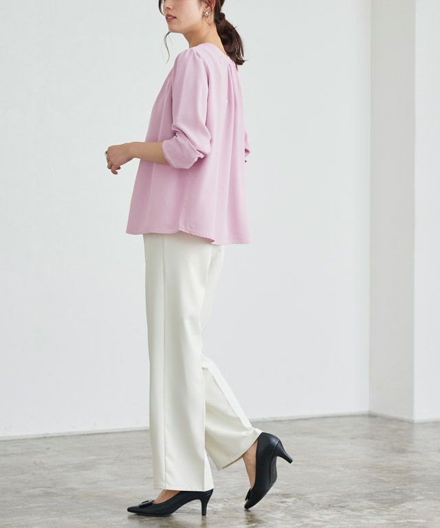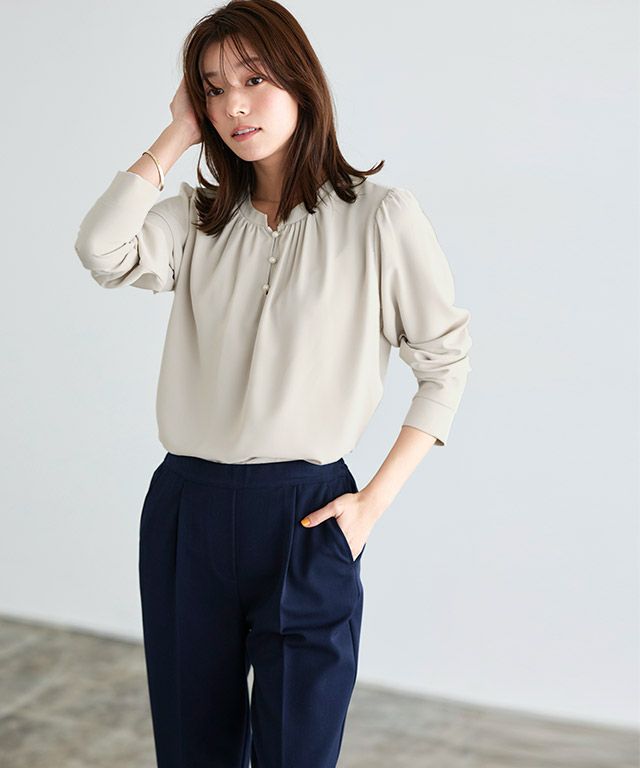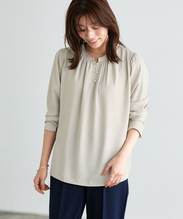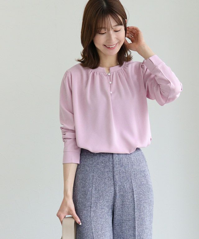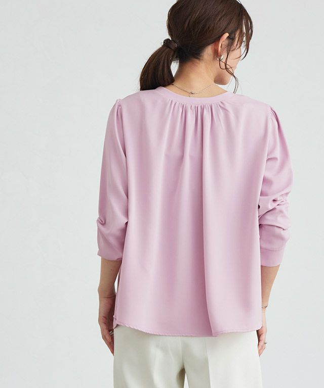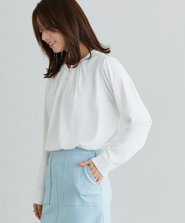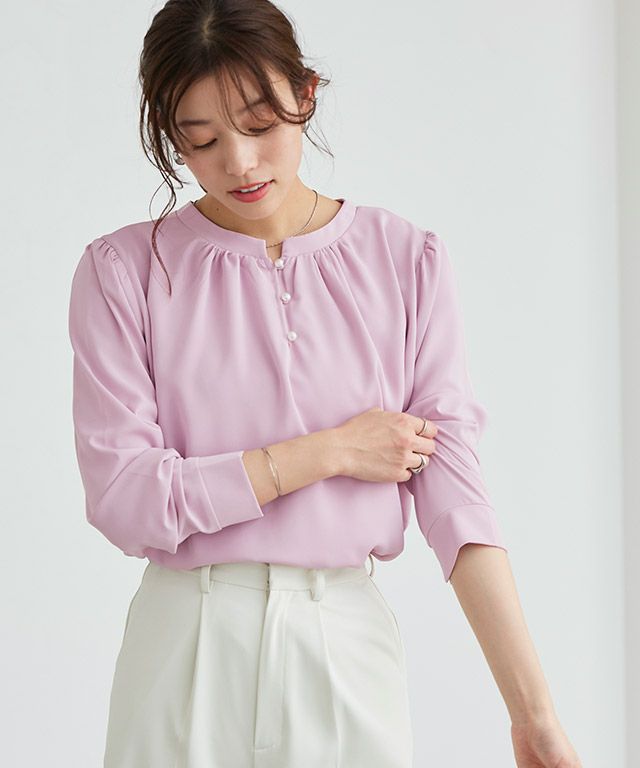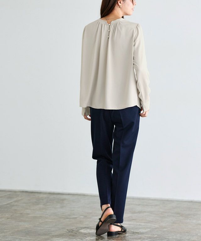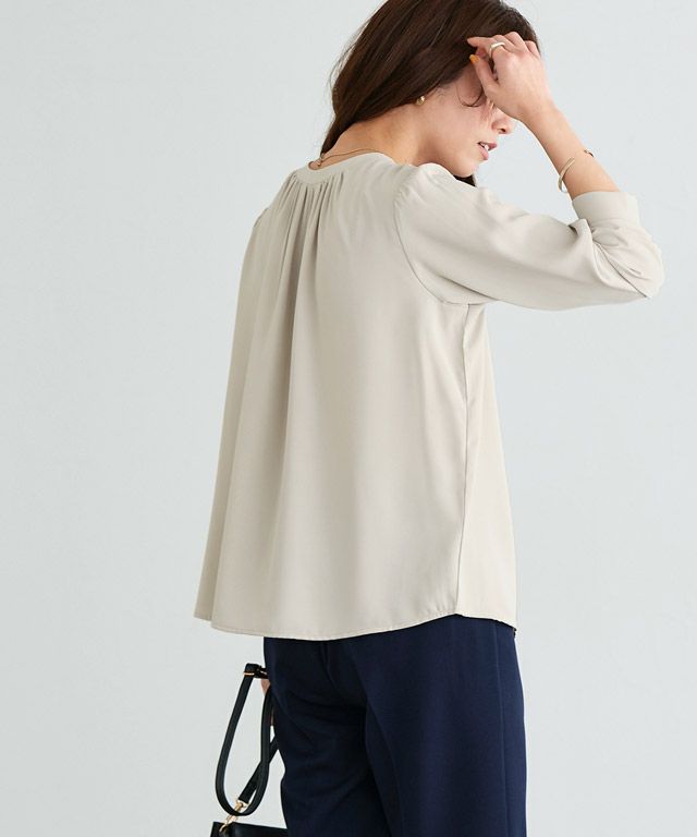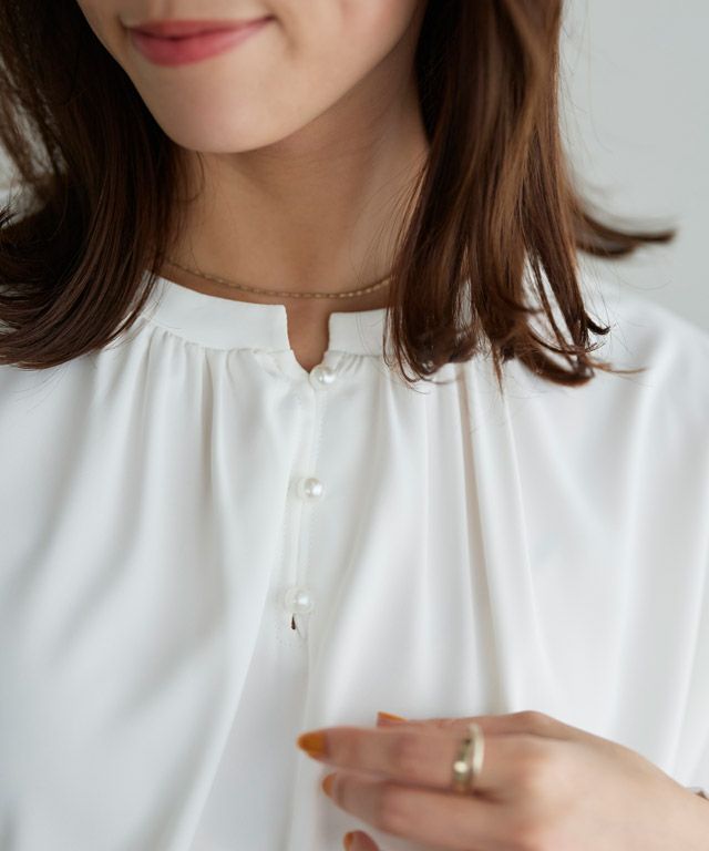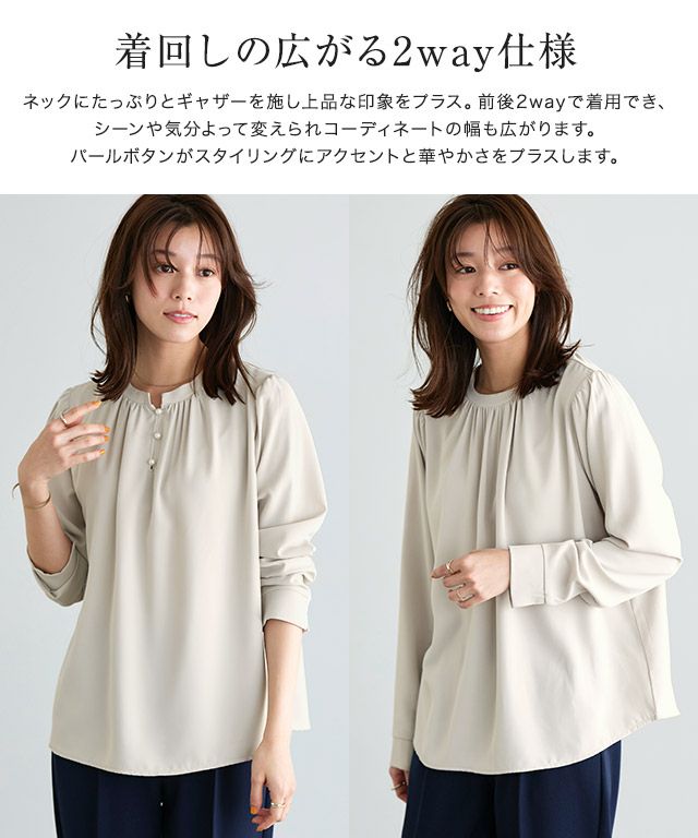 ネックにたっぷりとギャザーを施し上品な印象をプラス。前後2wayで着用でき、シーンや気分よって変えられコーディネートの幅も広がります。パールボタンがスタイリングにアクセントと華やかさをプラスします。