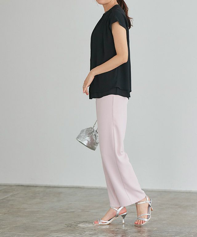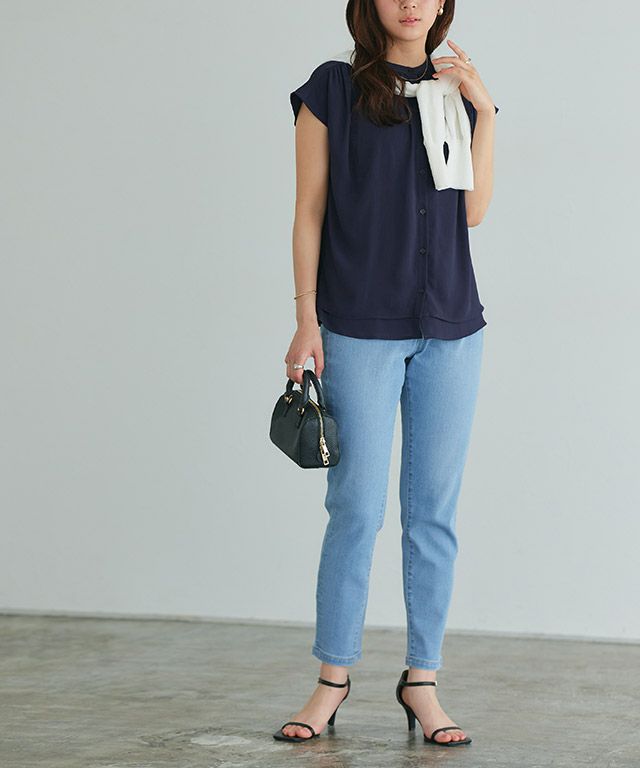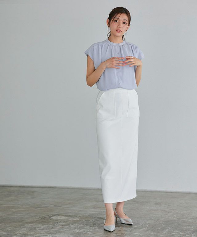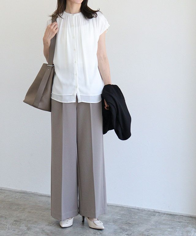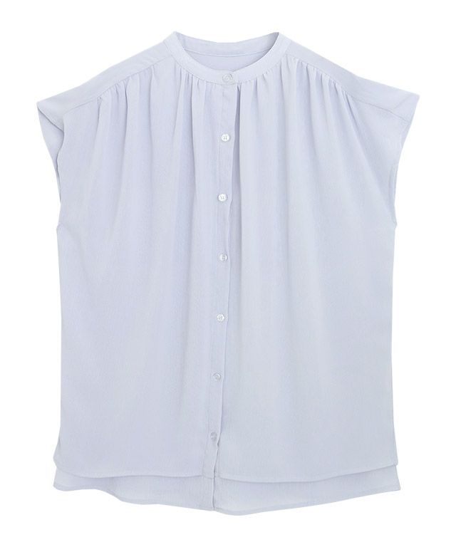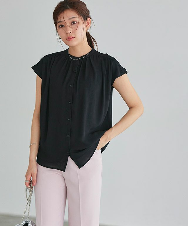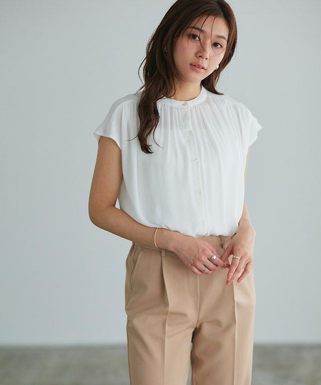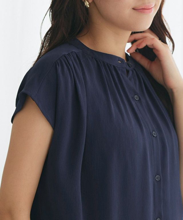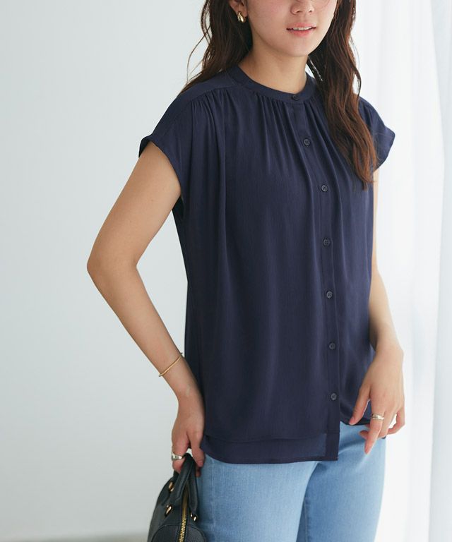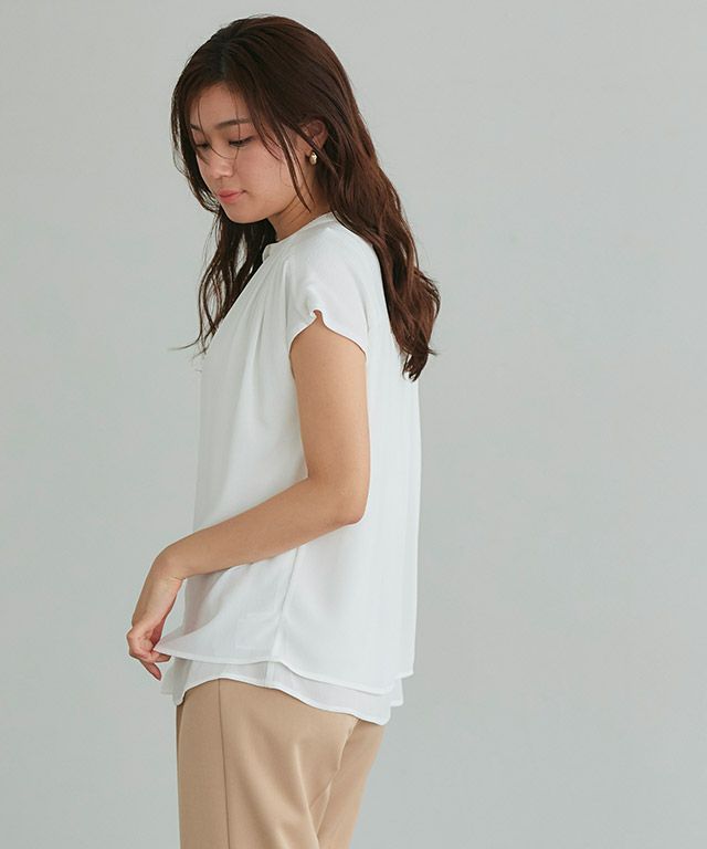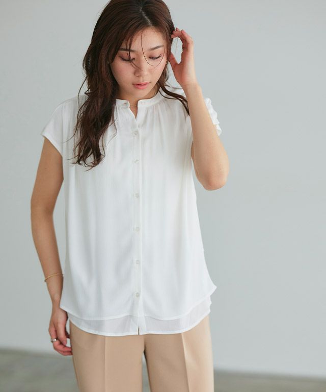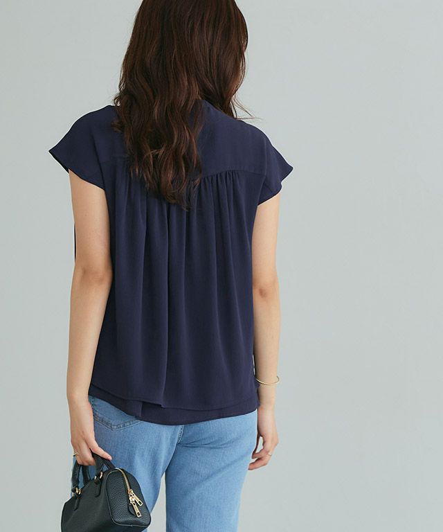 襟元から袖にかけて施したギャザーデザインが女性らしさを引き立てる一枚。フレンチスリーブがさり気なく二の腕周りをカバーしてくれるところも嬉しいポイントです。裾は二枚仕立てのデザインをあしらい、一枚で着映え感のあるブラウスに仕上げたON/OFF着回しが効くアイテムです。