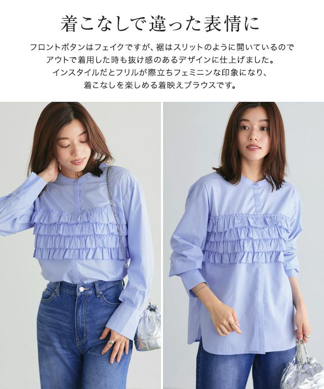 胸元に施したフリルがビスチェ風に見えるブラウス。重ね着をしなくても、トレンドのレイヤード風な着こなしができる一枚。フロントボタンはフェイクですが、裾はスリットのように開いているのでアウトで着用した時も抜け感のあるデザインに仕上げました。インスタイルだとフリルが際立ちフェミニンな印象になり、着こなしを楽しめる着映えブラウスです。
