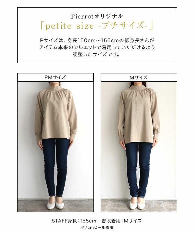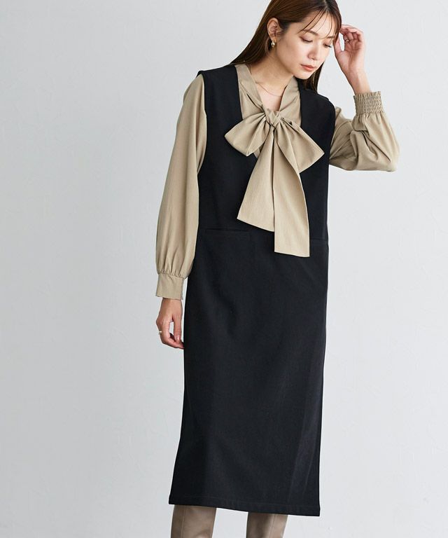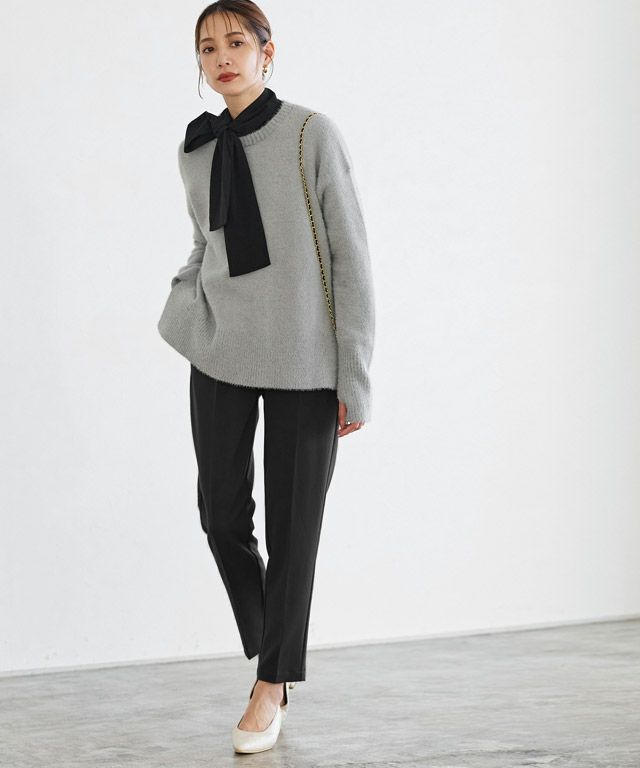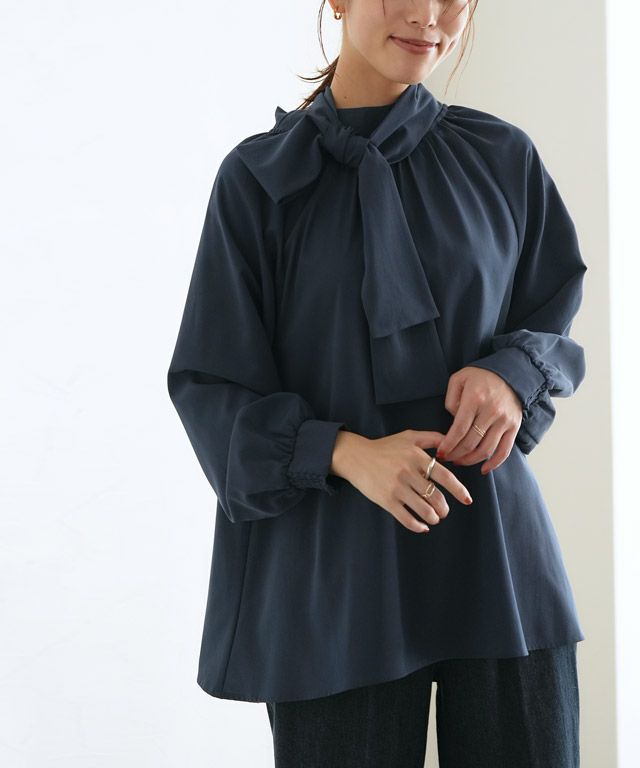 ハイネックとリボンの前後2wayで着用できるデザインブラウス。大きめのリボンがアクセントになりフェミニンな印象に。様々な結び方ができ、いろんなスタイリングに着回せます。ふんわり広がるAラインシルエットが女性らしく、腰周りの体型カバーにも◎インスタイルもしやすいフレア感に仕上げました。一枚での着用はもちろん、ジレやベスト、ジャケットなどのインナーとしての着用もおすすめです。