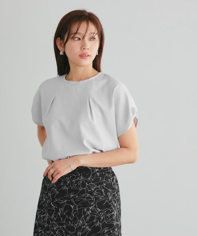 前後ネック部分に施したタックデザインがきれいめな印象へ導く一枚。袖口部分にはパールボタンをプラスして女性らしさを引き立てました。程良いシルエットと丈感でインスタイルももたつかず、すっきりと着用いただけます。