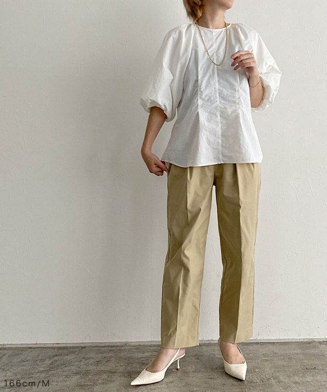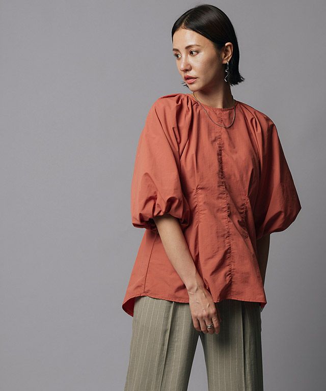 ボリュームたっぷりの袖のバルーンシルエットが大人フェミニンなブラウス。ウエストをシェイプさせてすっきりとした印象に。フェミニンになりすぎずメリハリのあるシルエットに仕上げました。