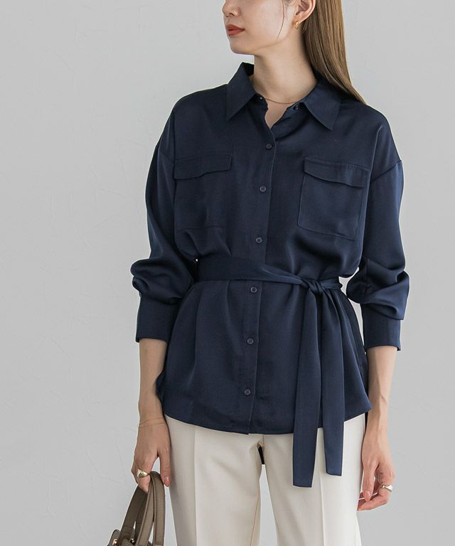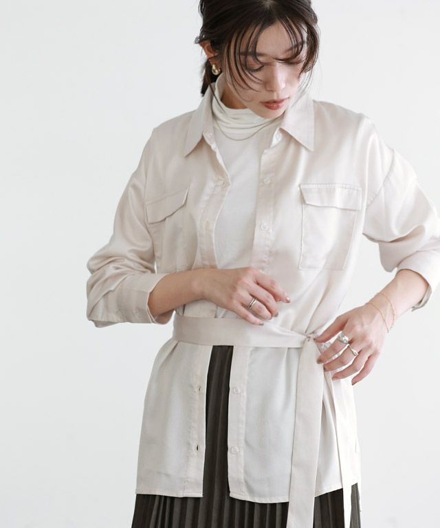 両胸元にあしらったポケットデザインがアクセントになる一枚。ややオーバーシルエットながらも、共地のリボンベルトでウエストマークすることでメリハリのある着こなしに仕上がります。長めの丈感が気になるヒップラインをしっかり隠してくれるところも嬉しいポイント。シャツとしてはもちろん、ボタンを外せば羽織りとしても活躍する万能アイテムです。
