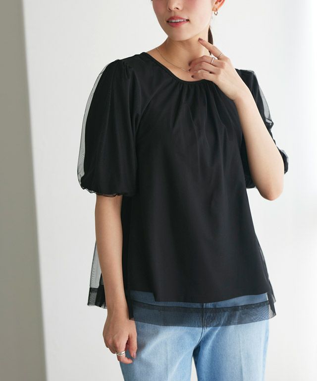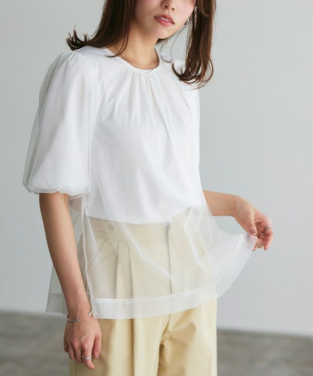 チュール素材を使ったトレンドライクな一枚。柔らかなチュール素材が女性らしい印象です。サラッとした肌触りのカットソーの裏地が付いているので、透け感を気にせず着用できます◎