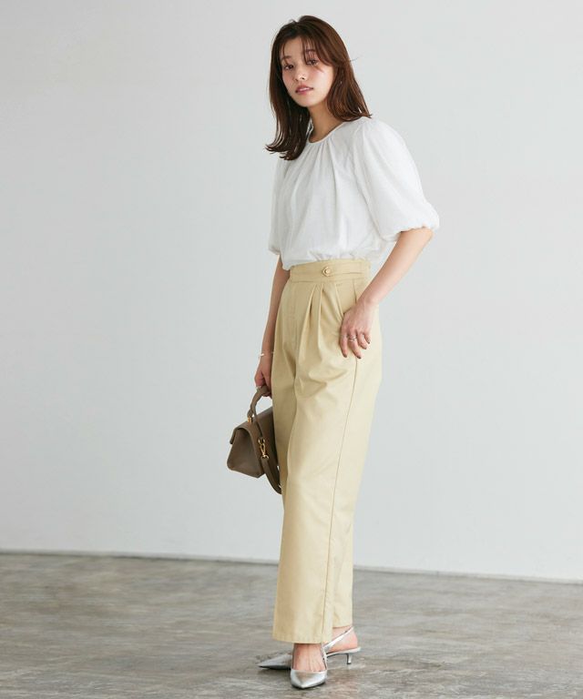 バルーンスリーブやギャザー使いが女性らしい印象のブラウス。裾は裏地と離れているので、イン、アウト、裏地のみインスタイルなど表情を変えて着回せます。