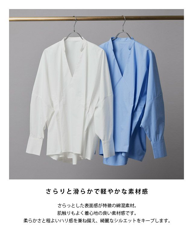 ウエストのタックデザインがアクセントになったブラウス。たっぷりの袖のボリューム感とシェイプされたシルエットがバランスの良いスタイリングに導きます。衿元はシャツ襟とVネックで上品な抜け感をプラス。フレアシルエットでウエスト周りをカバーしつつ、メリハリのあるシルエットに仕上げました。