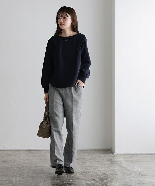 肩からボリュームを持たせたシルエットがポイントのプルオーバー。タックデザインがワンポイントになり、一枚で着映えるデザインです。ネックラインはボートネックで女性らしさをプラスし、裾のラウンドデザインも相まって柔らかな印象に。同素材のスカートとのセット着用もおすすめです。