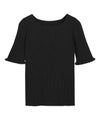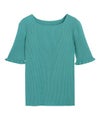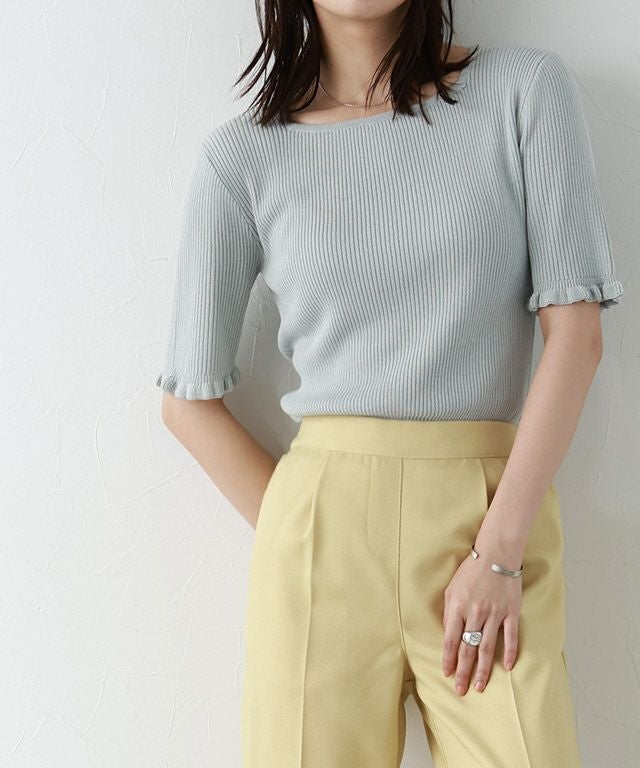 袖口にフリルを施し、程良くフェミニンな印象に仕上げたサマーニット。さりげないフリル使いがコーデのアクセントになり、シンプルながらも女性らしさを引き立ててくれます。身頃はコンパクトなサイジングなので、どんなボトムにも合わせやすい一枚です。