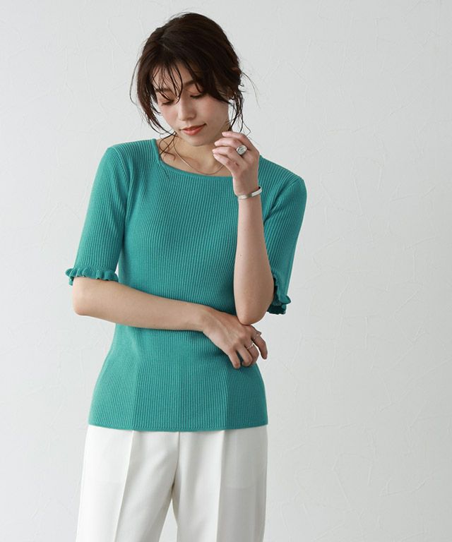 女性らしさ引き立つ“リネンタッチ袖フリルリブニット”