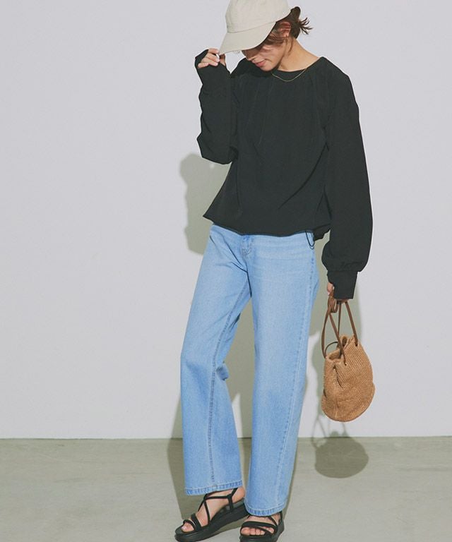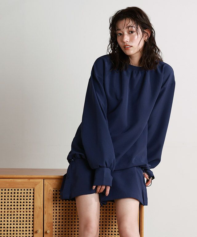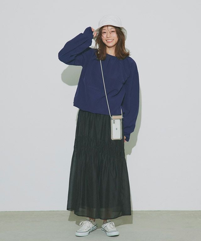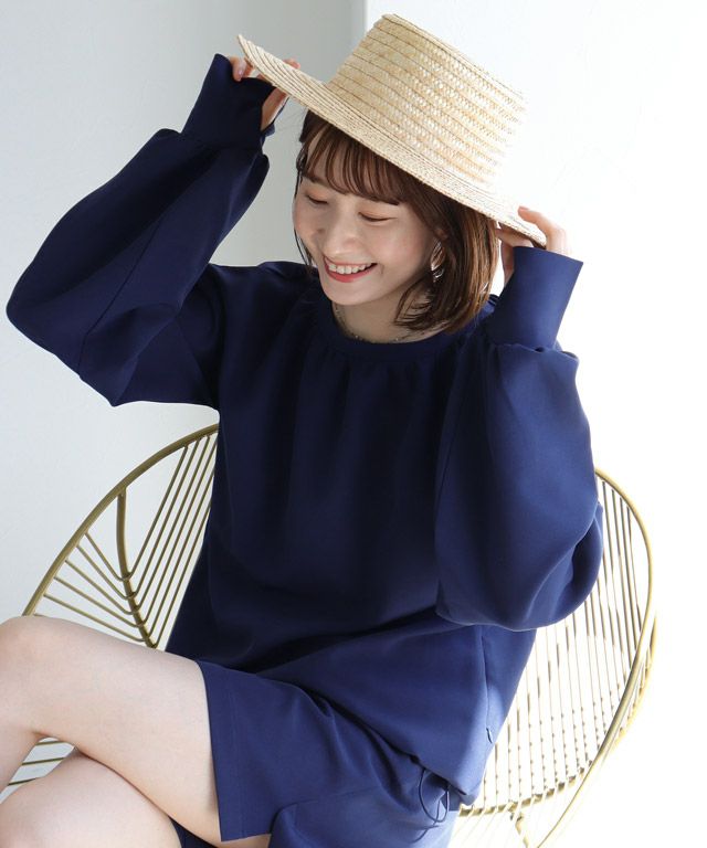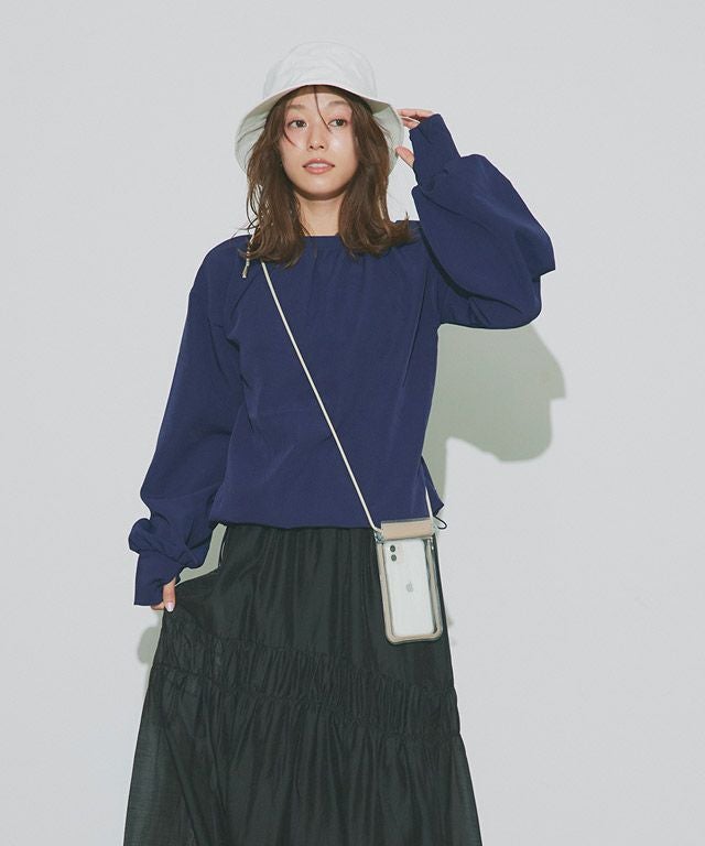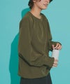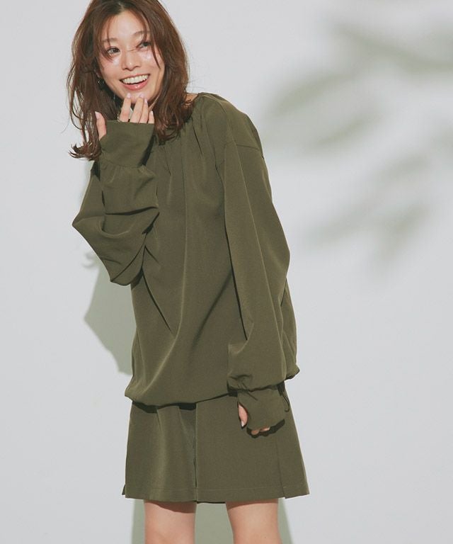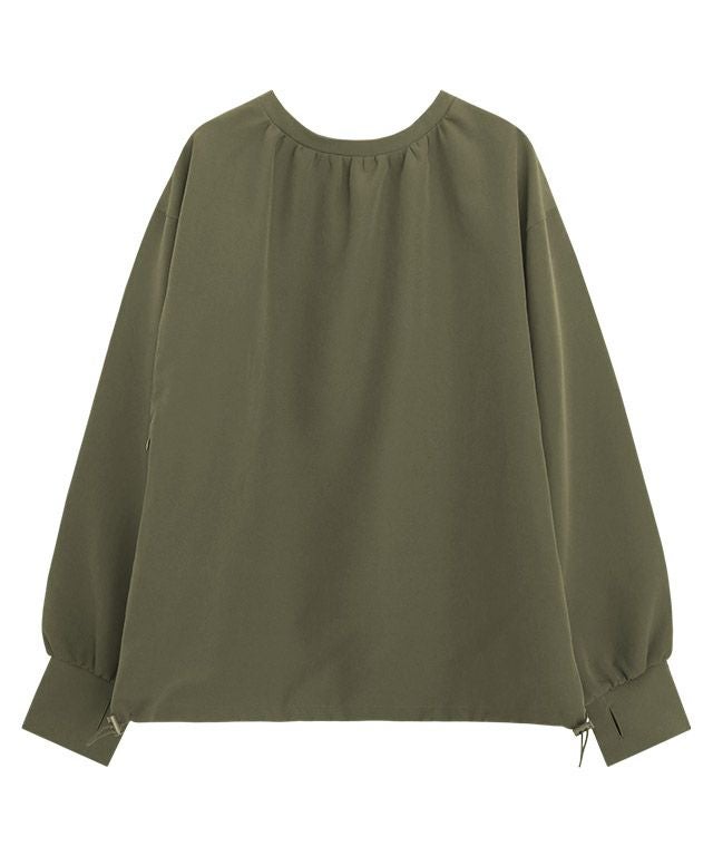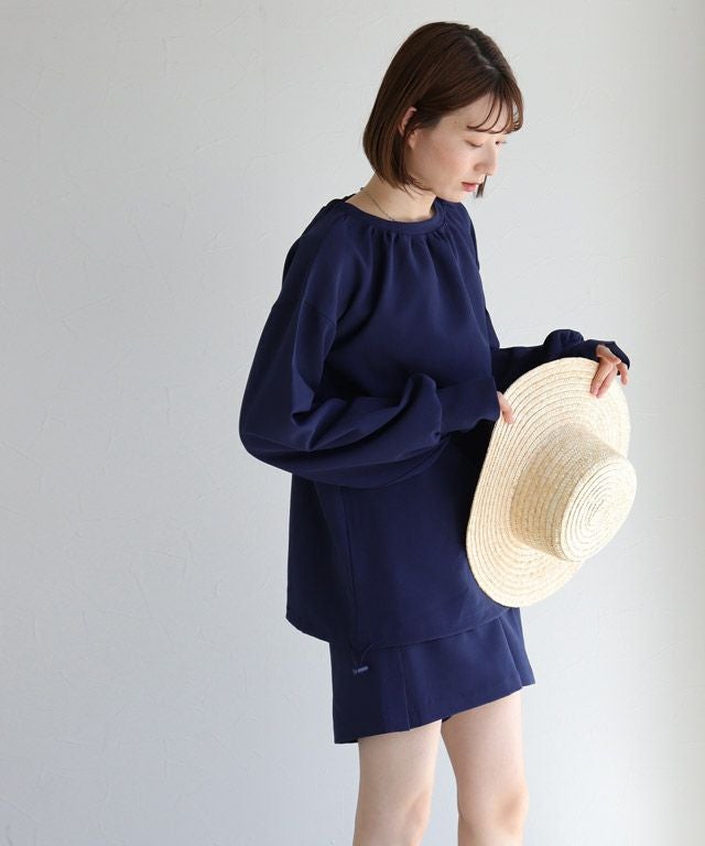 全体的にトレンドライクなボリューム感のあるシルエットで、ブラウス見えするようなデザインがポイントです。襟後ろをゴムにすることで着脱もしやすい仕様に。指穴も付いているので、手の甲まで守ってくれます。裾にはドロスト仕様をあしらい、シルエットチェンジや着水時のめくれ上がりなどの軽減が可能。
