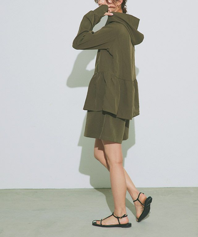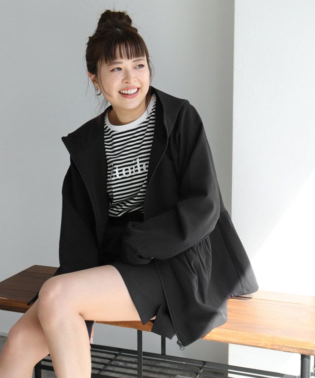 裾に向かって広がるフレアラインが、フェミニン感を演出。ウエストからヒップ周りの気になるラインもカバーしてくれます。やや深めのフードと、首をカバーしてくれる襟の高さにもこだわりました。指穴も付いているので手の甲まで守ってくれます。