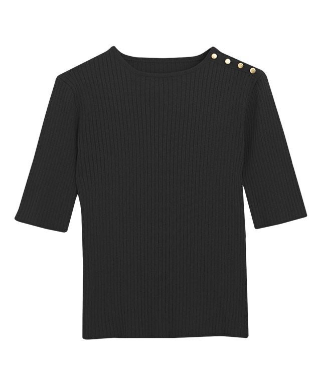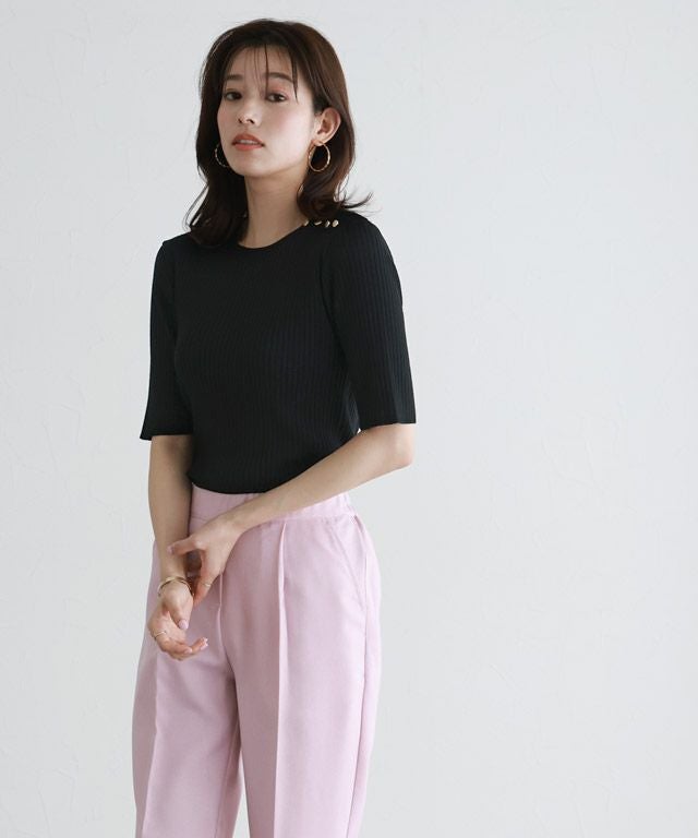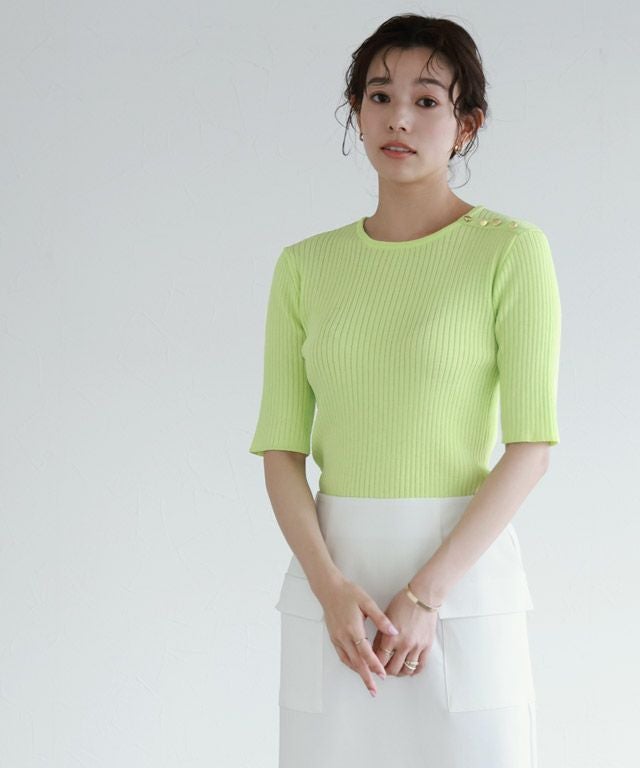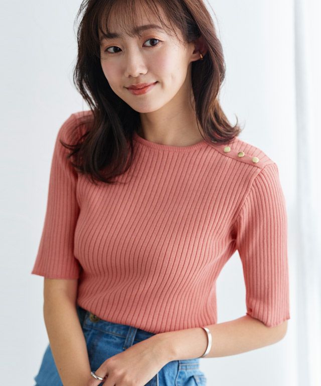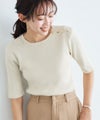 シンプルながらも肩のボタンがアクセントになったニット。ゴールドボタンで上品さがあり、トレンドのマリンスタイルにぴったりな一枚。二の腕まで隠れる五分袖も嬉しいポイントです。ボトムスを選ばず合わせやすいデザイントップスです。