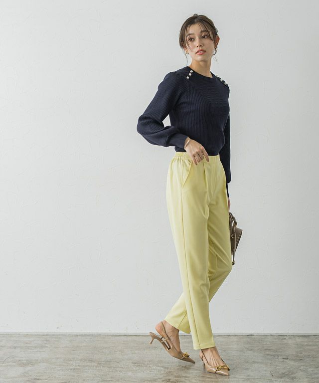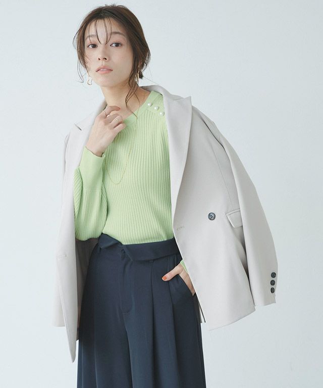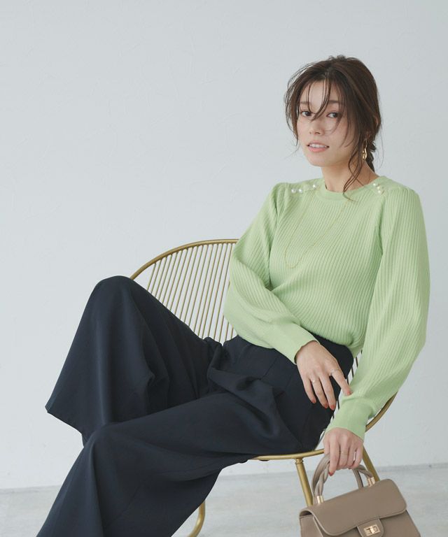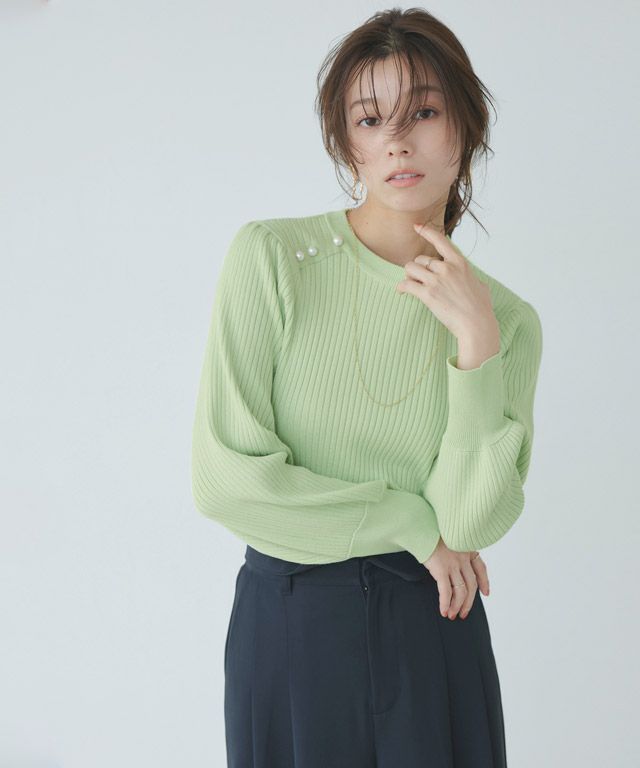肩にパールボタンを施し顔周りを華やかに仕上げた着映えニット。ふんわりボリューム感のある袖デザインが、女性らしい印象に導きます。インでもアウトでも使える程良くゆとりのあるサイズ感が嬉しい◎