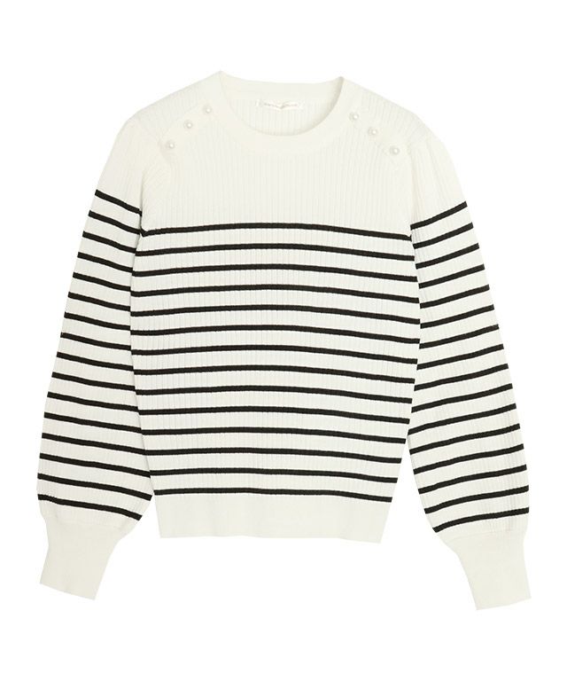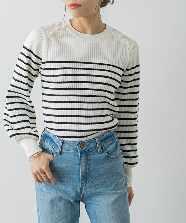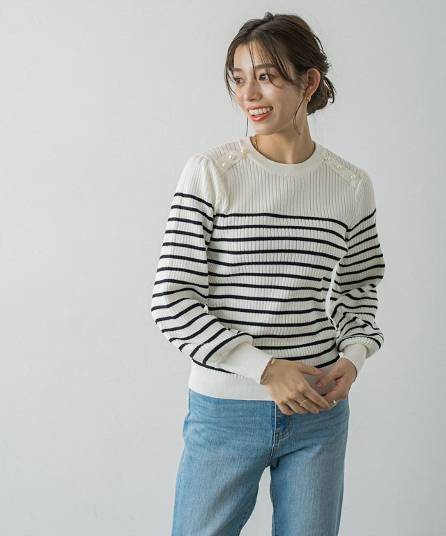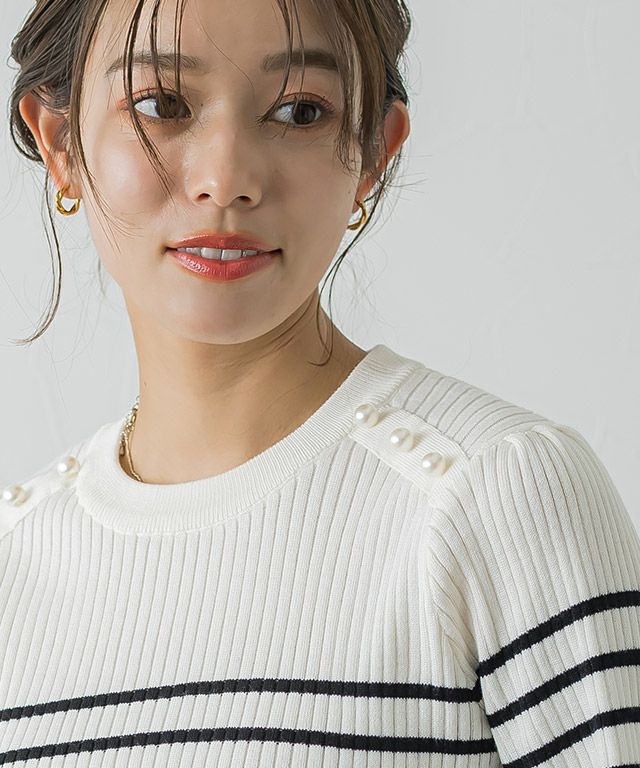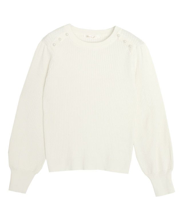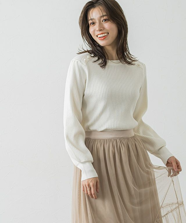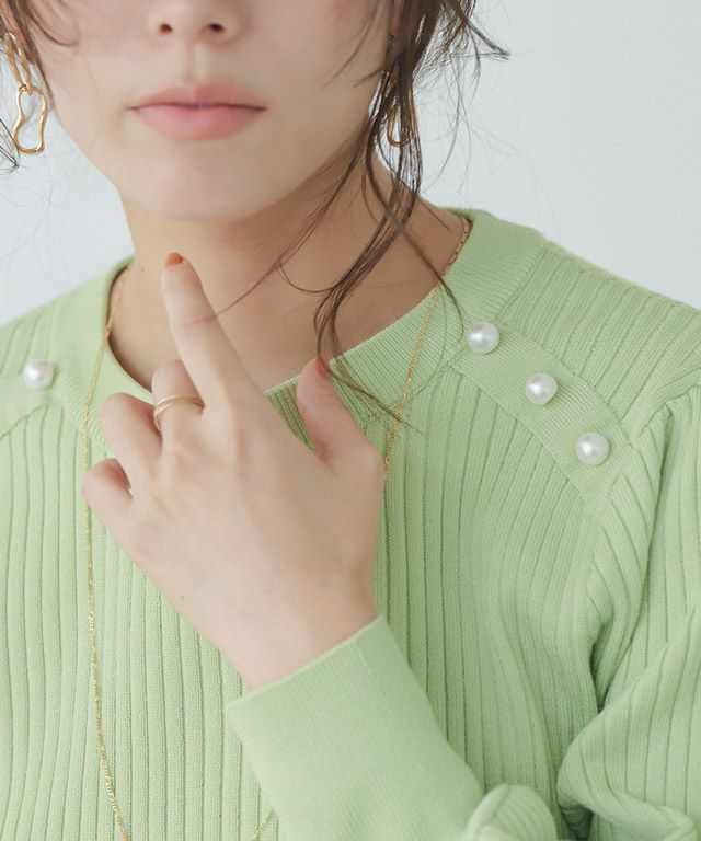 一枚で華やかな印象に“ショルダーパールボタンニット”