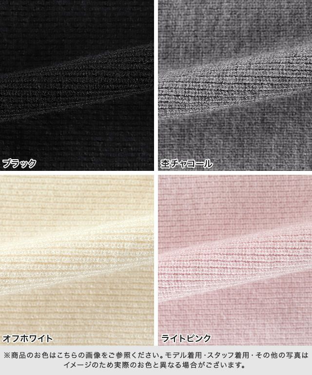 また、ニット製品は生産の過程上「生地を織る際の糸の継ぎ目」繊維の「混紡」、プレス加工、製品洗い加工によって形やサイズ(5cm前後)に誤差が生じる場合がございますが品質上の問題はございません。