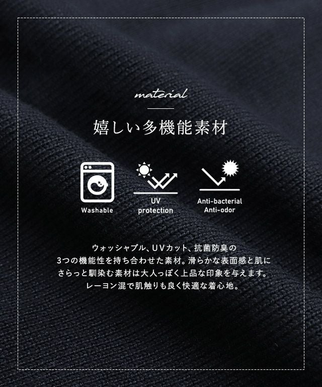ウォッシャブル、抗菌防臭、UVカットの3つの機能性を持ち合わせた素材。滑らかな表面感と肌にさらっと馴染む素材は大人っぽく上品な印象を与えます。レーヨン混で肌触りも良く快適な着心地。