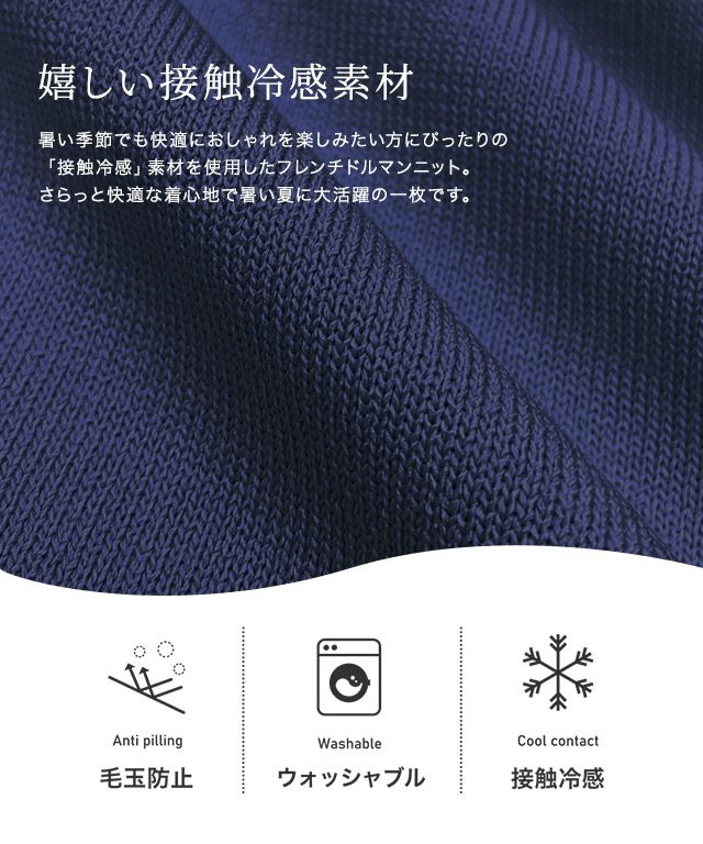 暑い季節でも快適におしゃれを楽しみたい方にぴったりの「接触冷感」素材を使用したフレンチドルマンニット。さらっと快適な着心地で暑い夏に大活躍の一枚です。