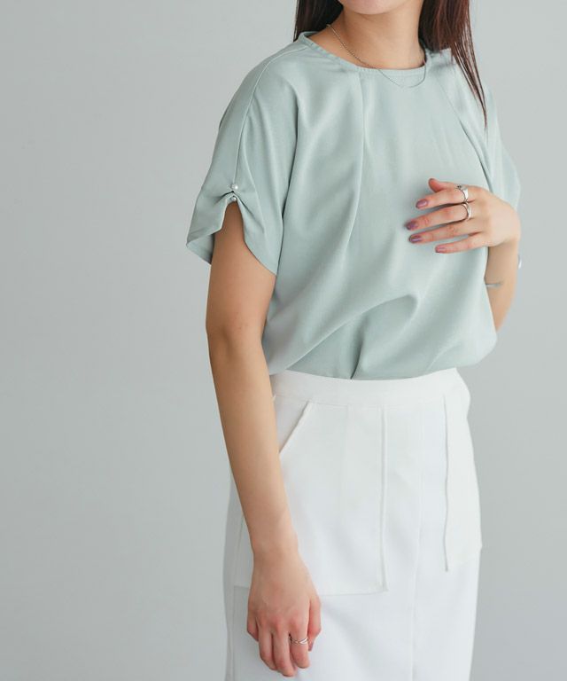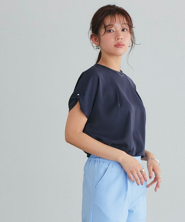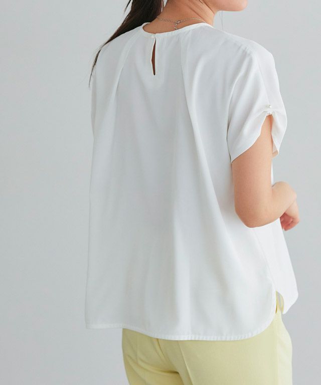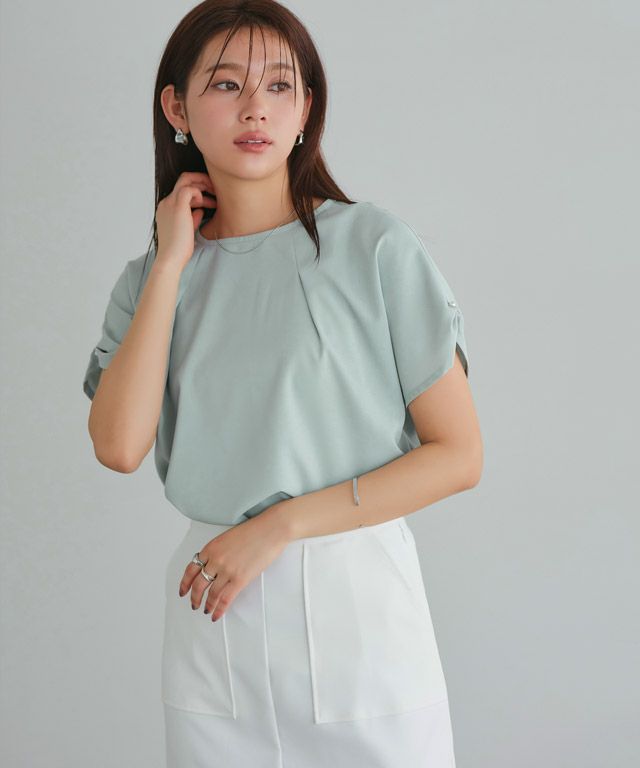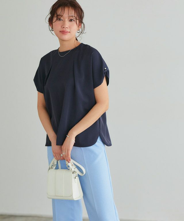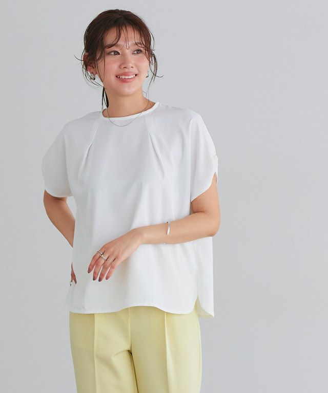 前後ネック部分に施したタックデザインがきれいめな印象へ導く一枚。袖口部分にはパールボタンをプラスして女性らしさを引き立てました。程良いシルエットと丈感でインスタイルももたつかず、すっきりと着用いただけます。