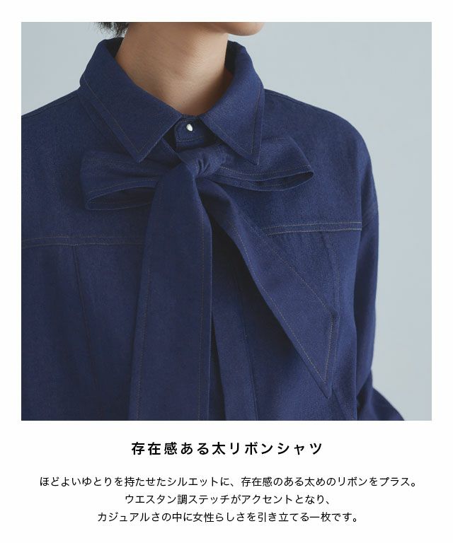 ほどよいゆとりを持たせたシルエットに、存在感のある太めのリボンをプラス。ウエスタン調ステッチがアクセントとなり、カジュアルさの中に女性らしさを引き立てる一枚です。
