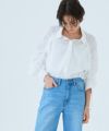 肩から袖にかけて施されたシャーリングがたっぷりのギャザーを作り出し、華やかな雰囲気溢れるアイテム。シャーリングの絞り具合で印象の変わるデザインです。シャツ襟とすっきりと見える比翼仕立てできちんとした印象に仕上げました。