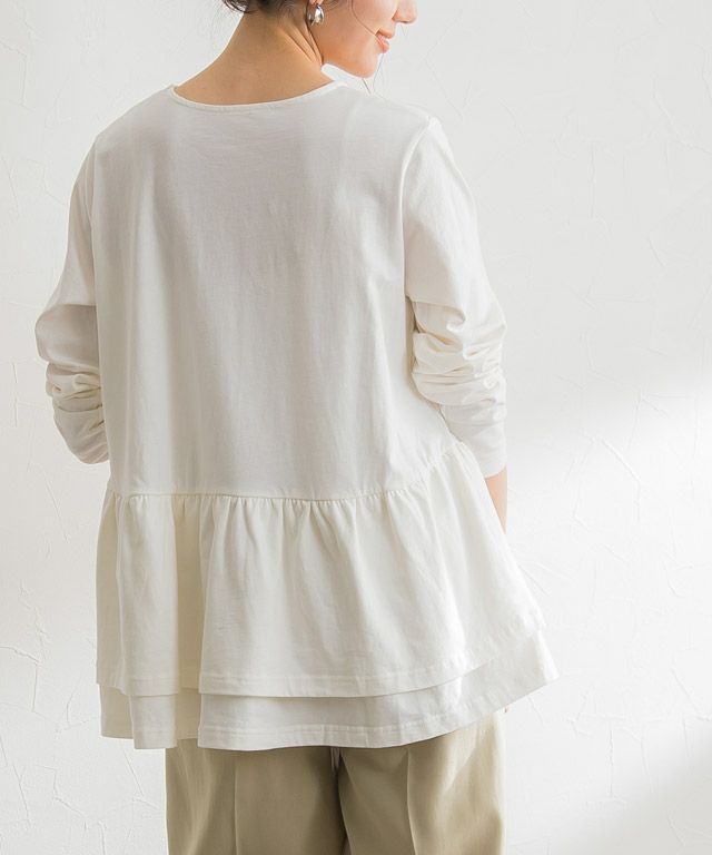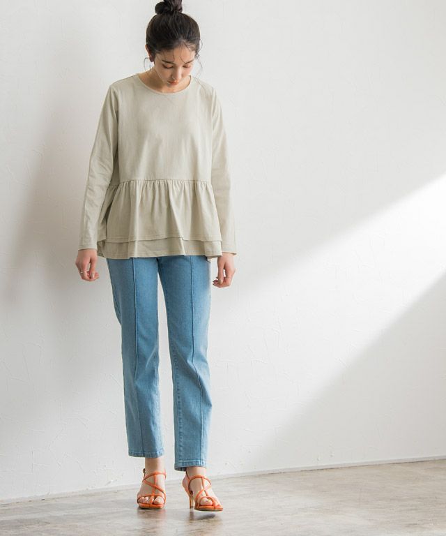 ウエストから広がるフリルデザインがフェミニンな印象の一枚。腰回りの体型カバーにもなる優秀デザインです。シンプルにパンツやスカートと合わせてもサマ見えするアイテムです。