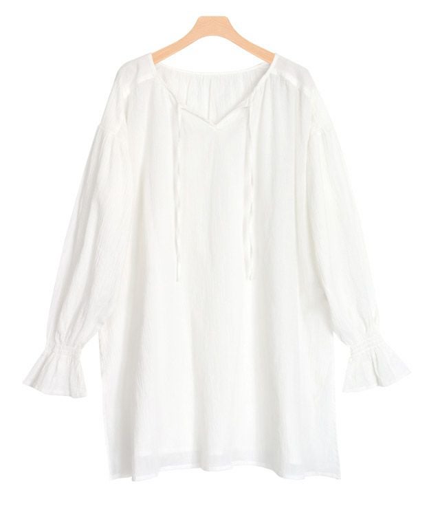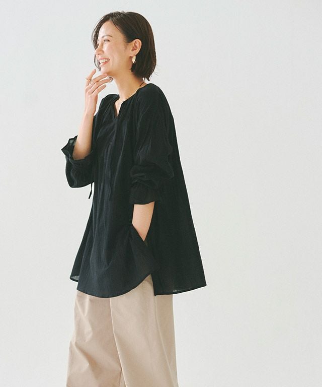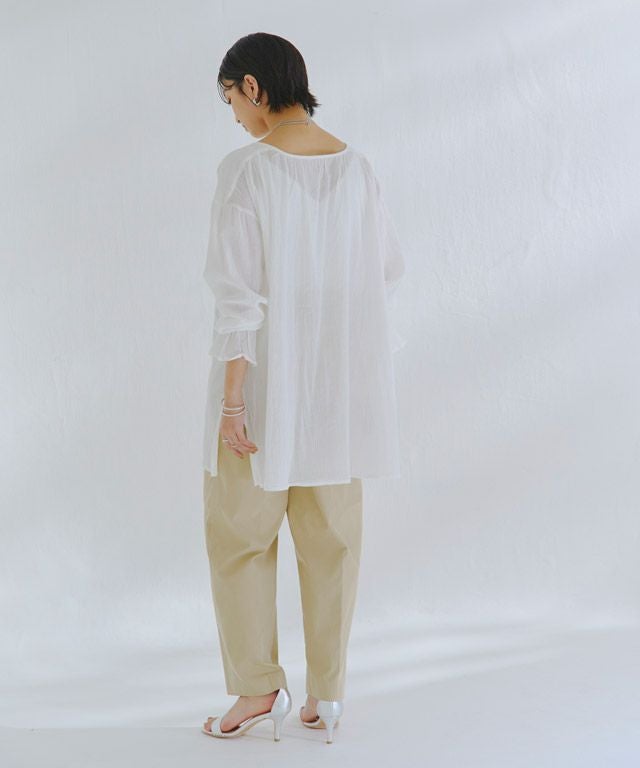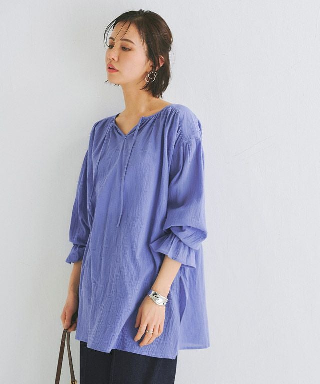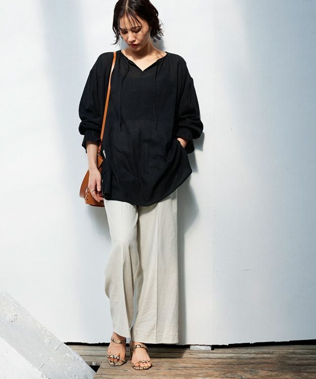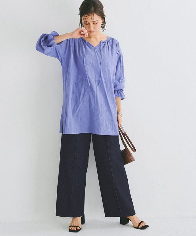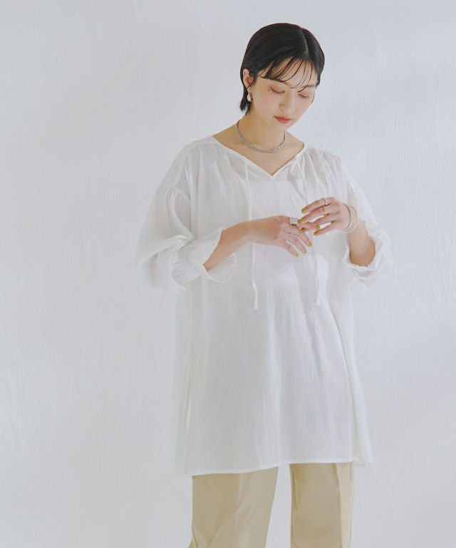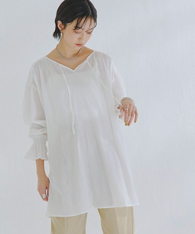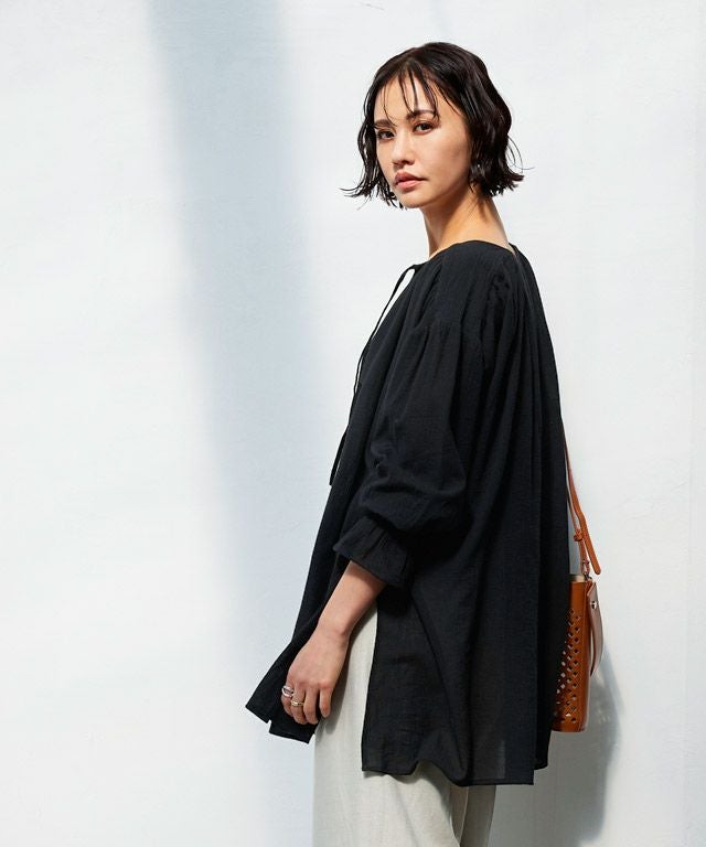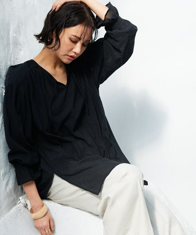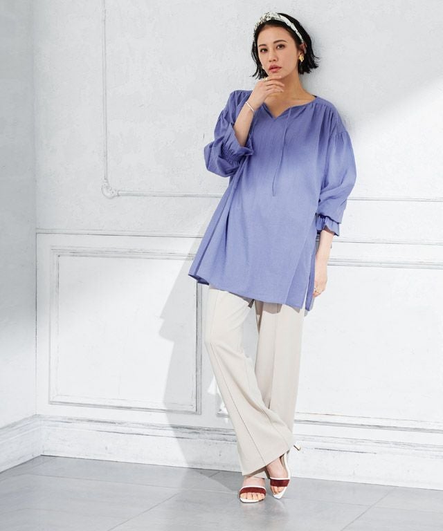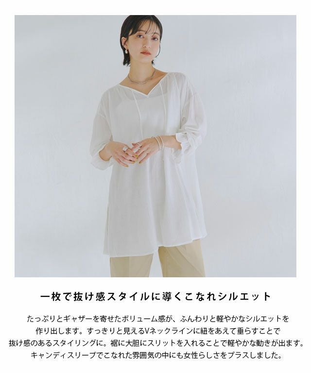 たっぷりとギャザーを寄せたボリューム感が、ふんわりと軽やかなシルエットを作り出します。すっきりと見えるVネックラインに紐をあえて垂らすことで抜け感のあるスタイリングに。裾に大胆にスリットを入れることで軽やかな動きが出ます。キャンディスリーブでこなれた雰囲気の中にも女性らしさをプラスしました。