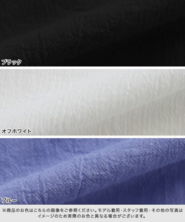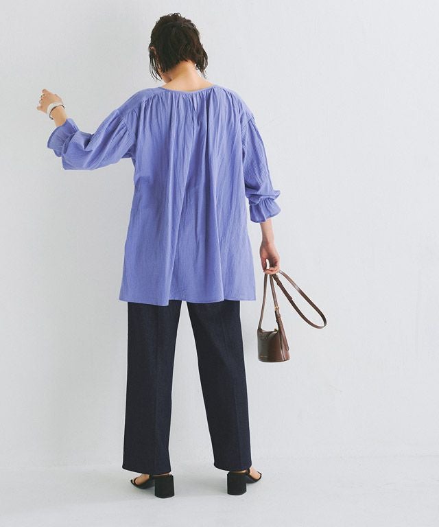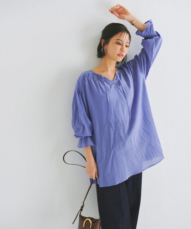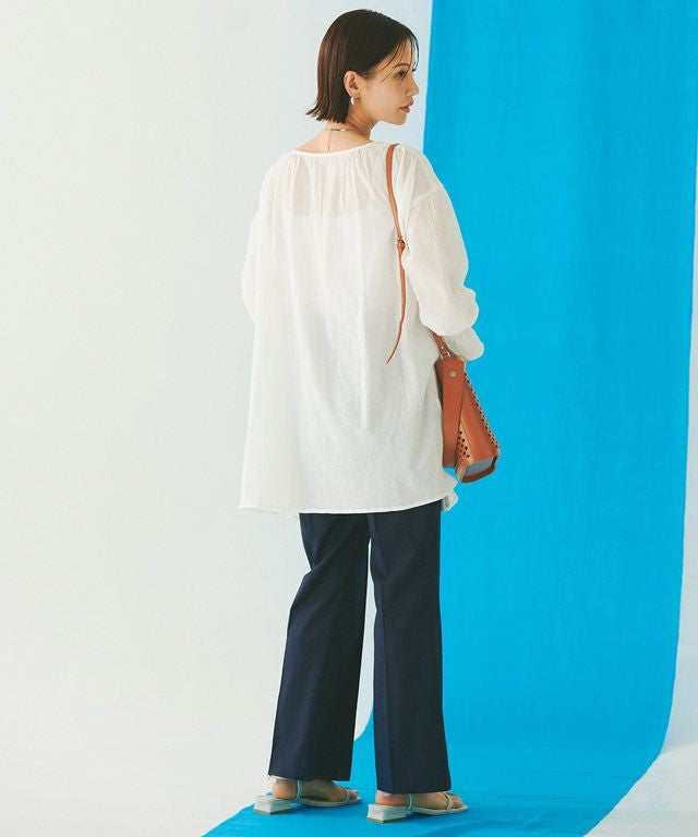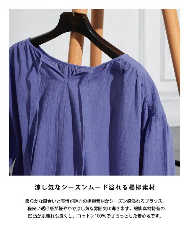 柔らかな風合いと表情が魅力の楊柳素材がシーズン感溢れるブラウス。程良い透け感が軽やかで涼し気な雰囲気に導きます。楊柳素材特有の凹凸が肌離れも良くし、コットン100%でさらっとした着心地です。