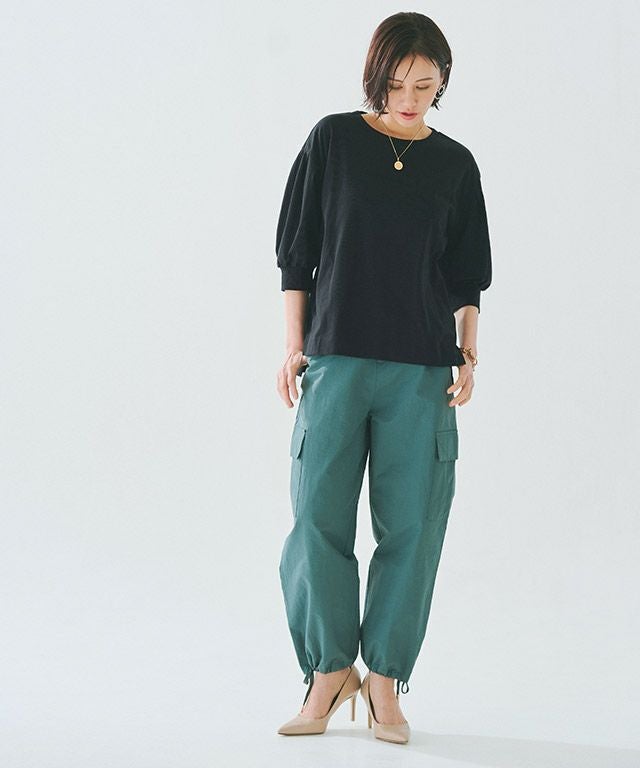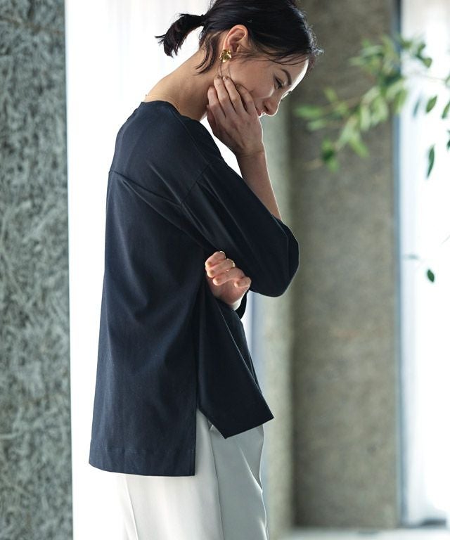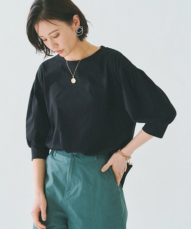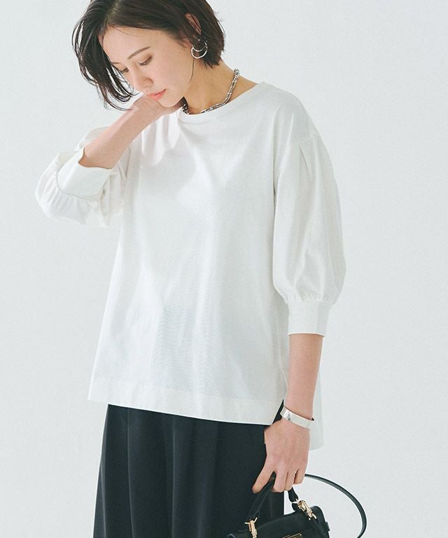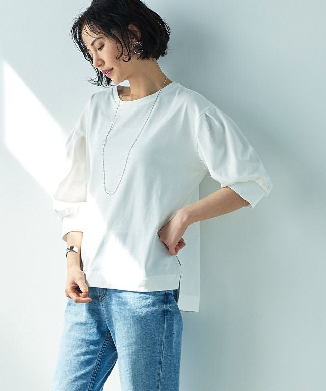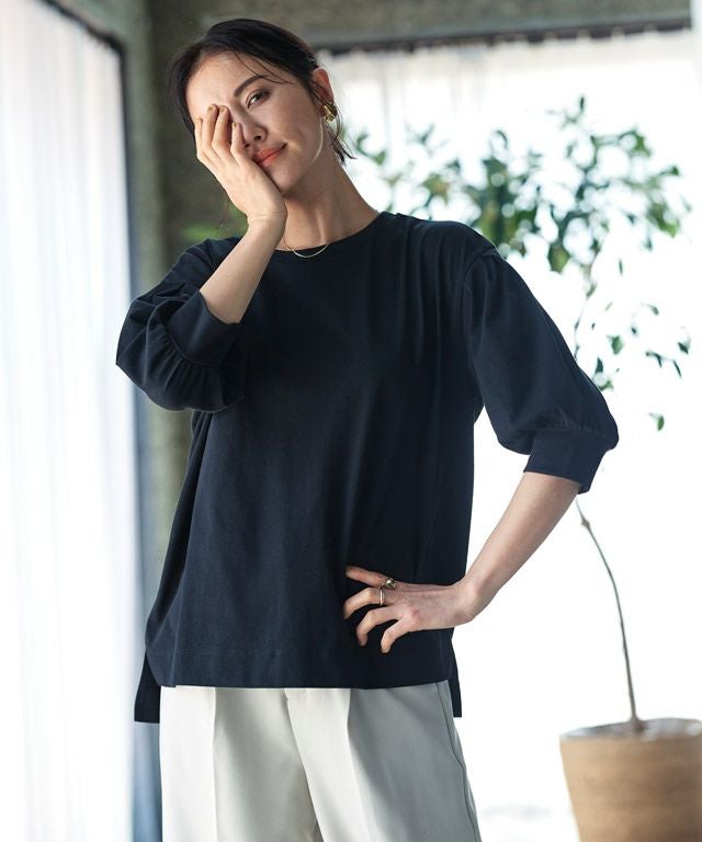 袖口にタックを施したボリュームスリーブが目を惹くデザイン。カフスは長めに設定し、カジュアルながらもきちんと感のある印象に仕上げました。しっかりと腕周りをカバーしてくれるところも魅力の一つです。サイドのスリットで抜け感をプラスし、コンパクトな丈感がアウトスタイルでもバランスよく着こなせる一枚。前後差のある着丈で後ろは長めのデザインのため、ほどよく腰回りやヒップラインを隠してくれます。