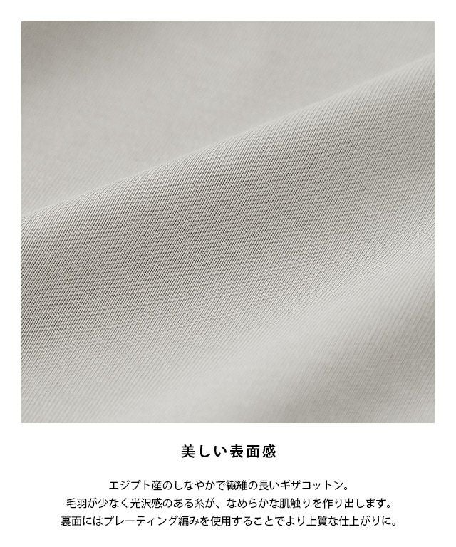 エジプト産のしなやかで繊維の長いギザコットン。毛羽が少なく光沢感のある糸が、なめらかな肌触りを作り出します。裏面にはプレーティング編みを使用することでより上質な仕上がりに。糸にはUVケア・抗菌防臭・しわにもなりにくいイージーケア加工を施しました。毎日使いたいシンプルなアイテムだからこそ機能性にもこだわった一枚です。