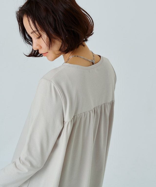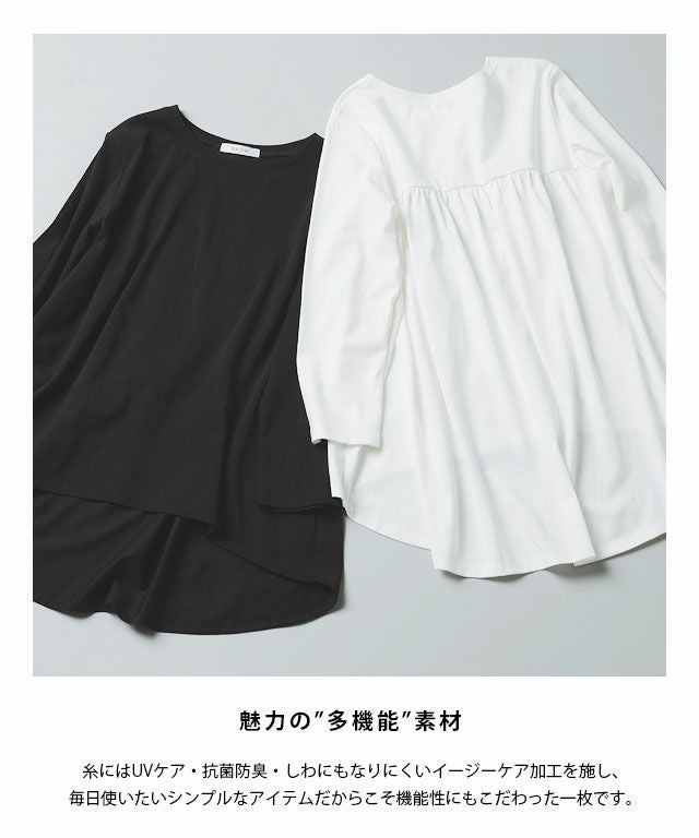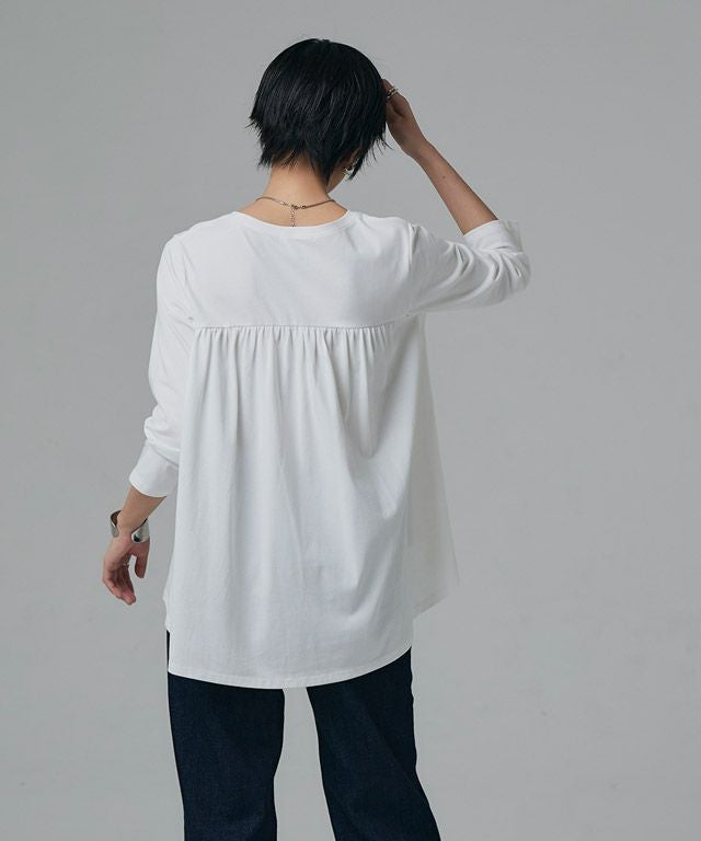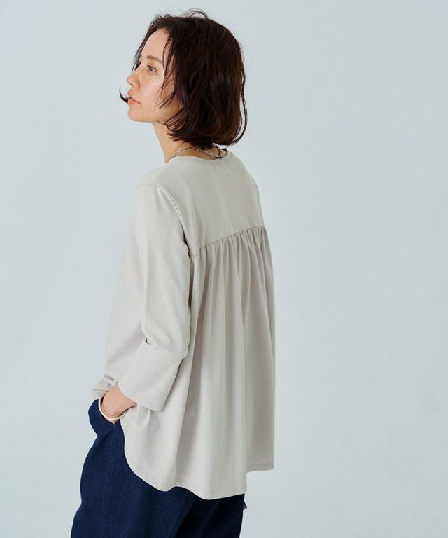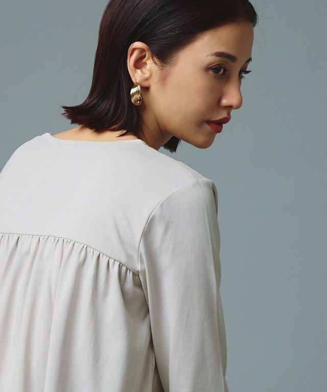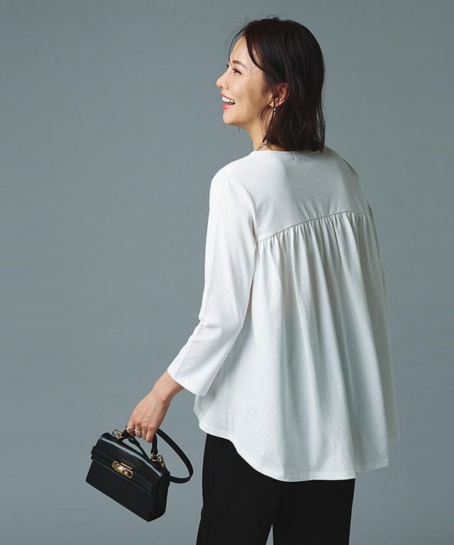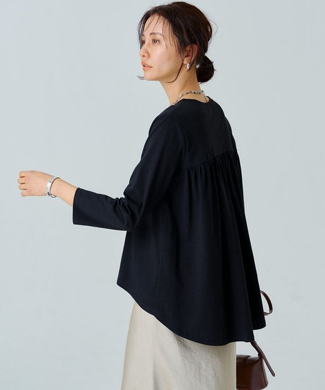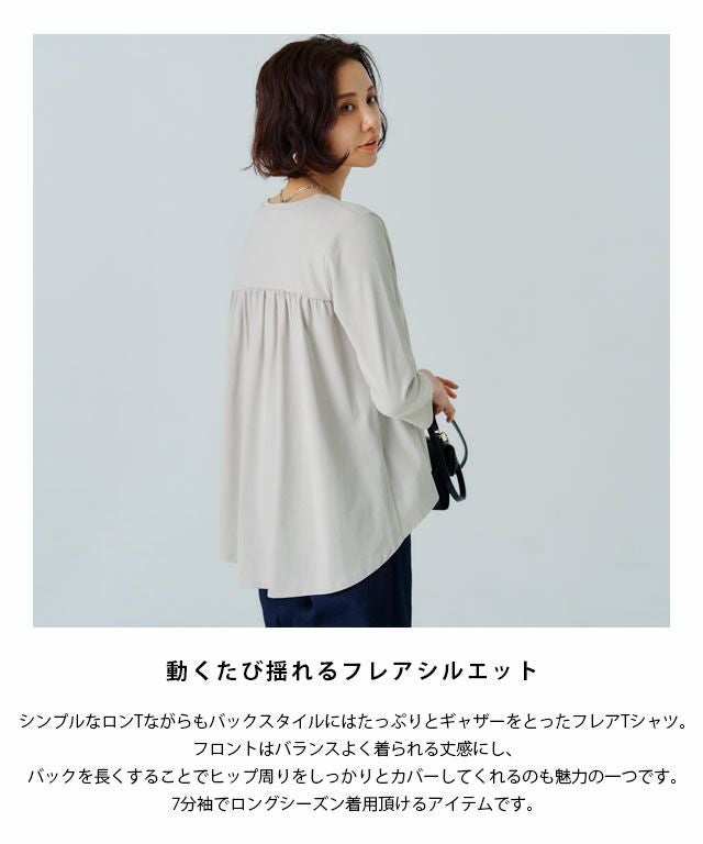 シンプルなロンTながらもバックスタイルにはたっぷりとギャザーをとったフレアTシャツ。フロントはバランスよく着られる丈感にし、バックを長くすることでヒップ周りをしっかりとカバーしてくれるのも魅力の一つです。7分袖でロングシーズン着用頂けるアイテムです。