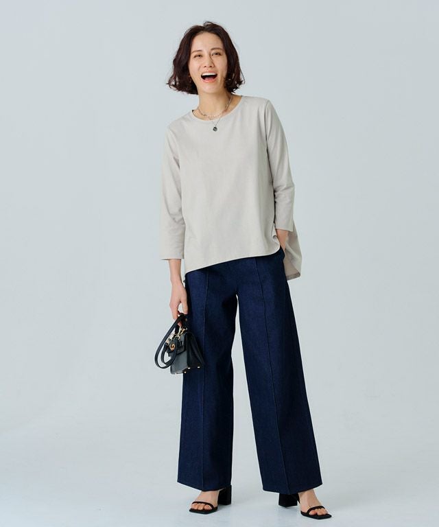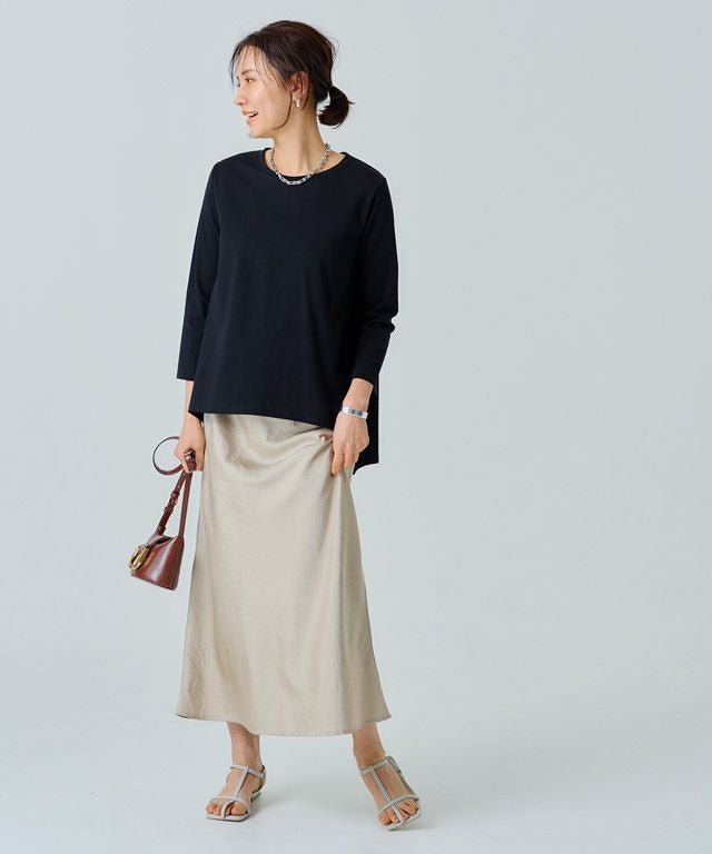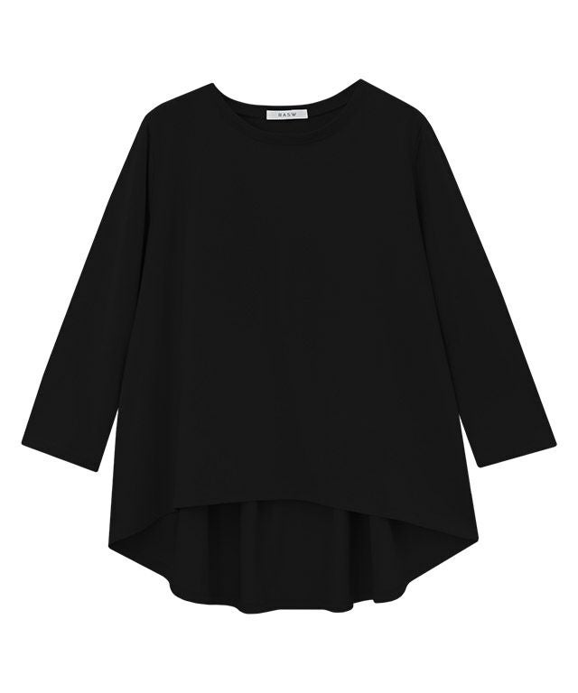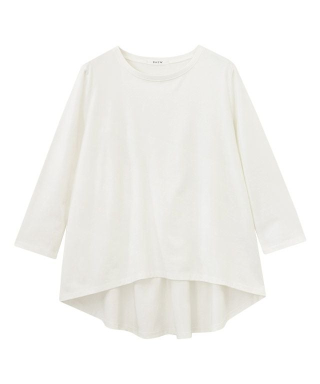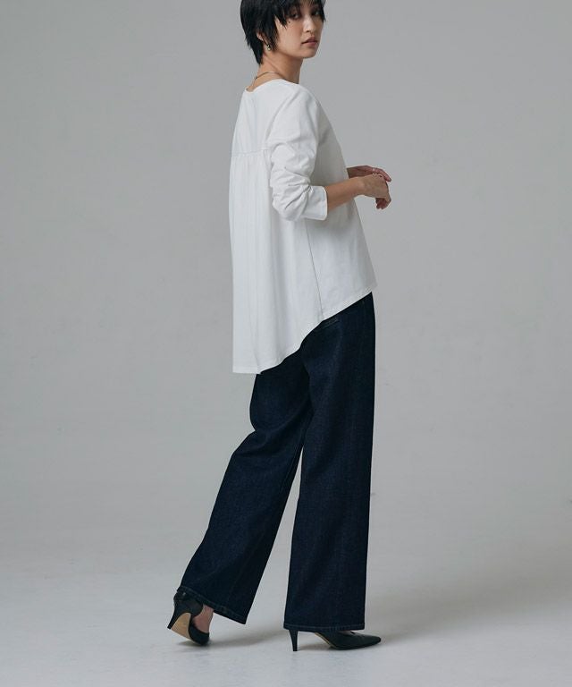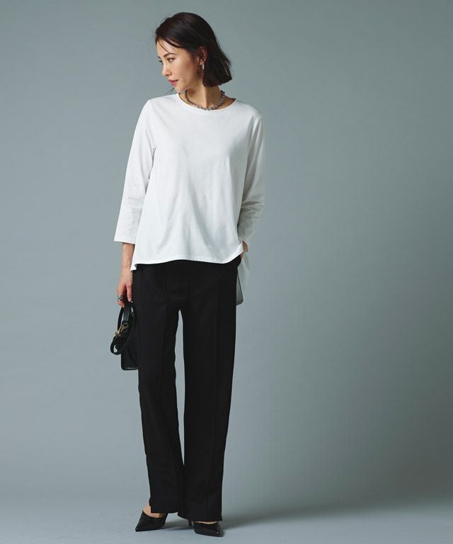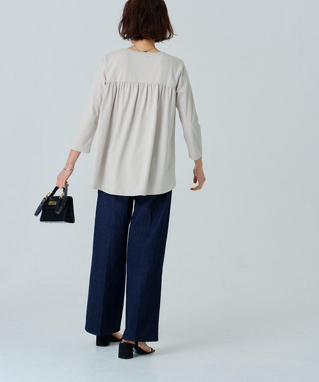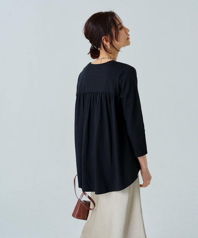 シンプルなロンTながらもバックスタイルにはたっぷりとギャザーをとったフレアTシャツ。フロントはバランスよく着られる丈感にし、バックを長くすることでヒップ周りをしっかりとカバーしてくれるのも魅力の一つです。7分袖でロングシーズン着用頂けるアイテムです。