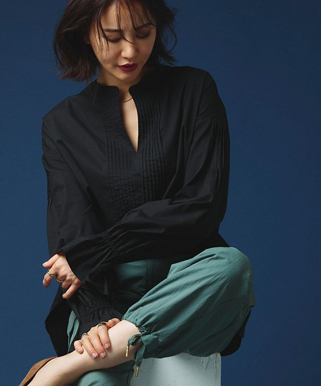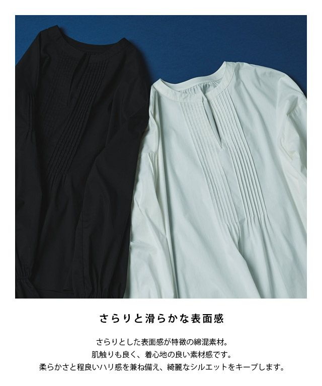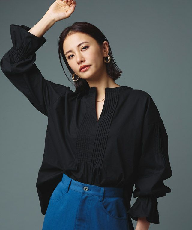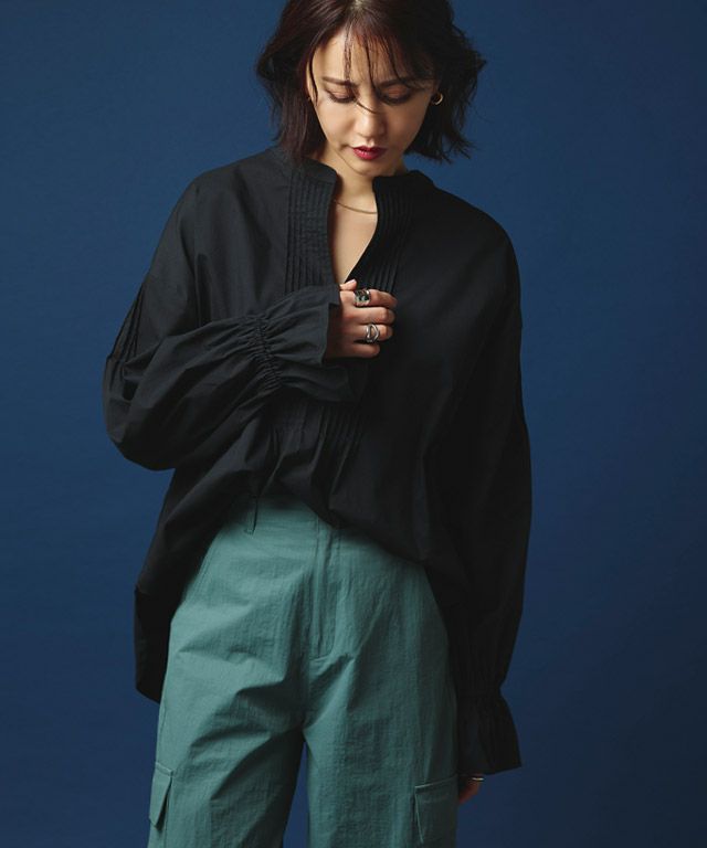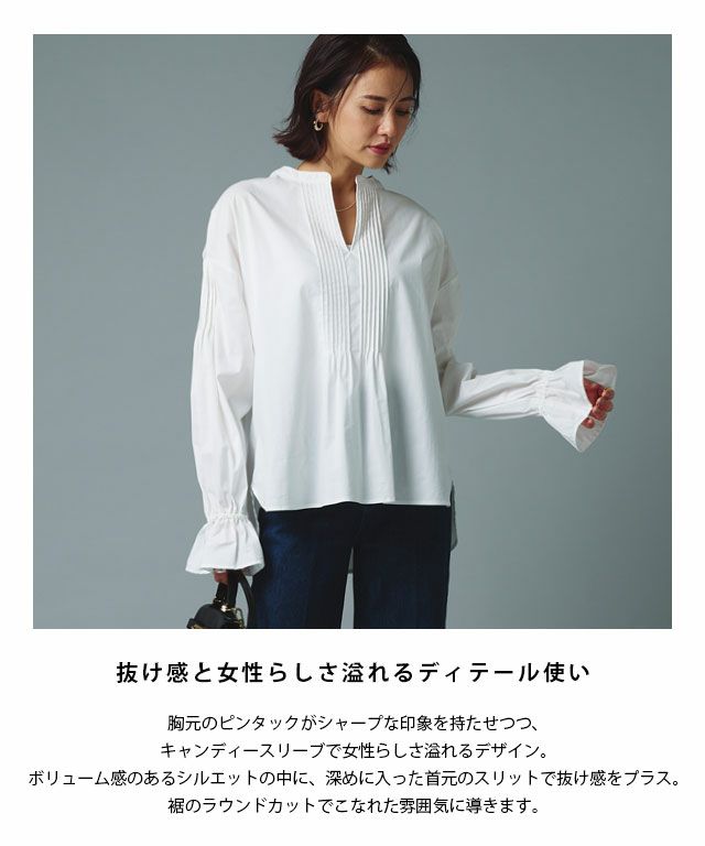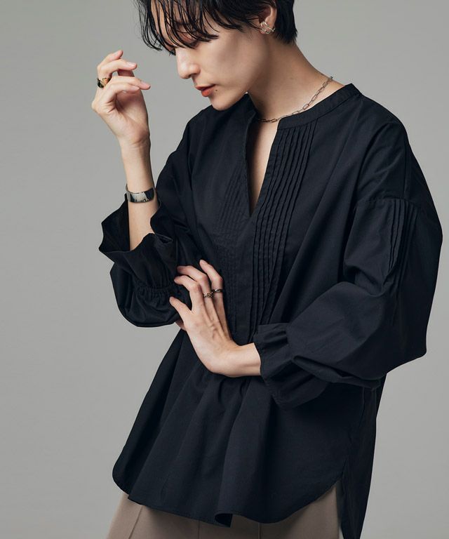 胸元のピンタックがシャープな印象を持たせつつ、キャンディースリーブで女性らしさ溢れるデザイン。裾のラウンドカットでこなれた雰囲気に導きます。ボリューム感のあるシルエットの中に、首元に深めに入ったスリットで大人の抜け感をプラス。細部までこだわりの詰まったデザインブラウスです。