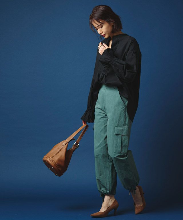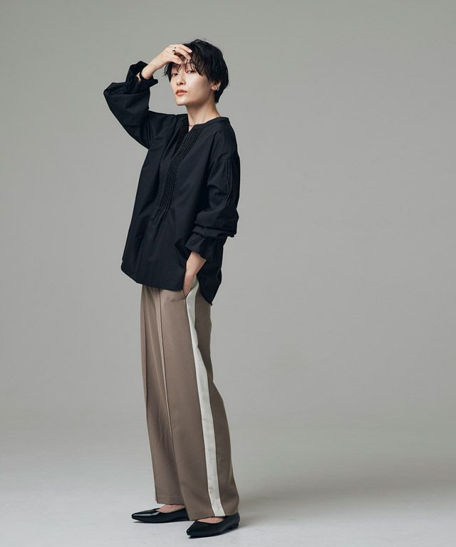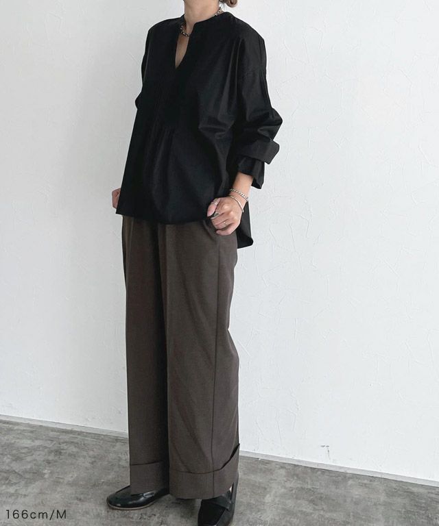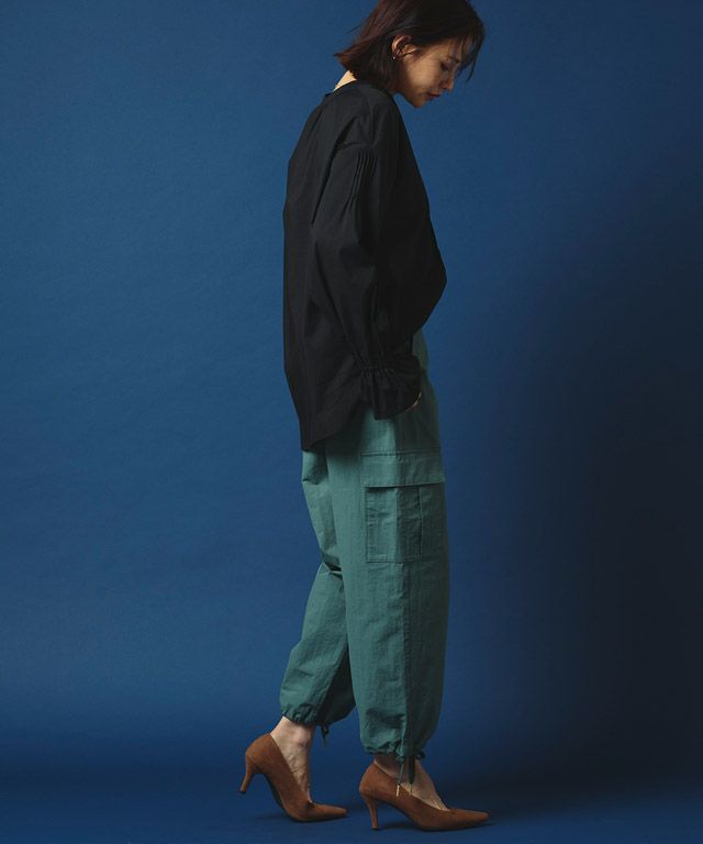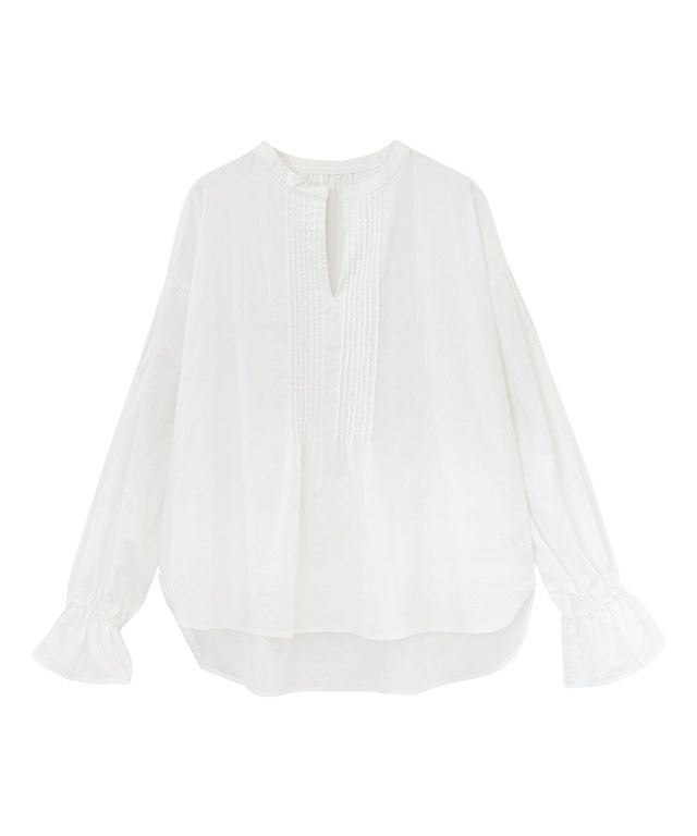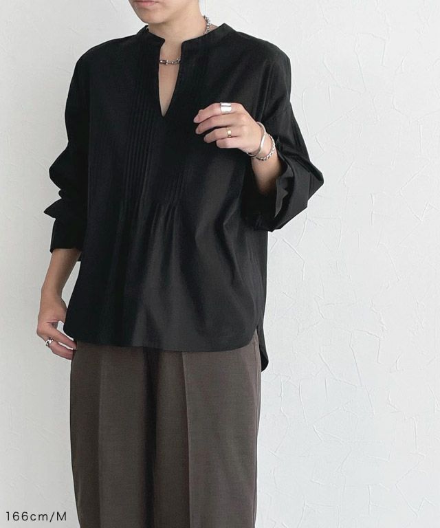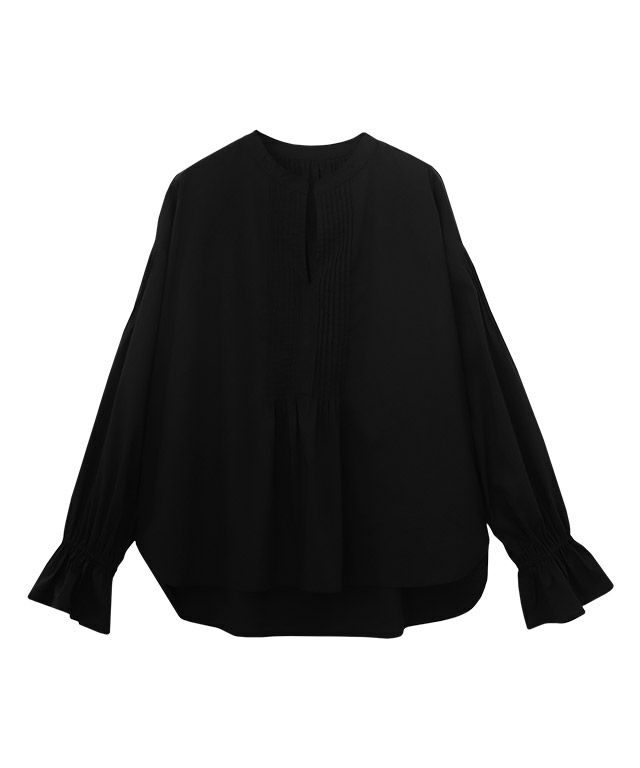胸元のピンタックがシャープな印象を持たせつつ、キャンディースリーブで女性らしさ溢れるデザイン。裾のラウンドカットでこなれた雰囲気に導きます。ボリューム感のあるシルエットの中に、首元に深めに入ったスリットで大人の抜け感をプラス。細部までこだわりの詰まったデザインブラウスです。