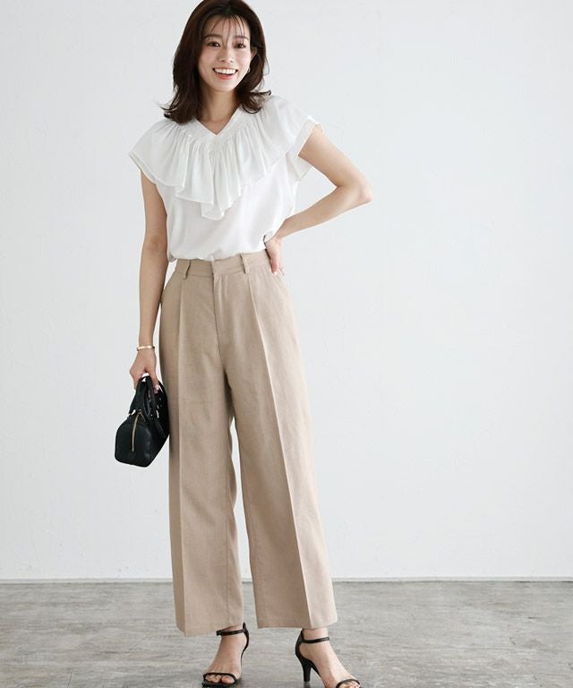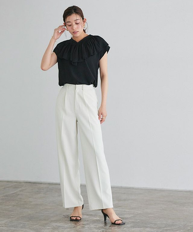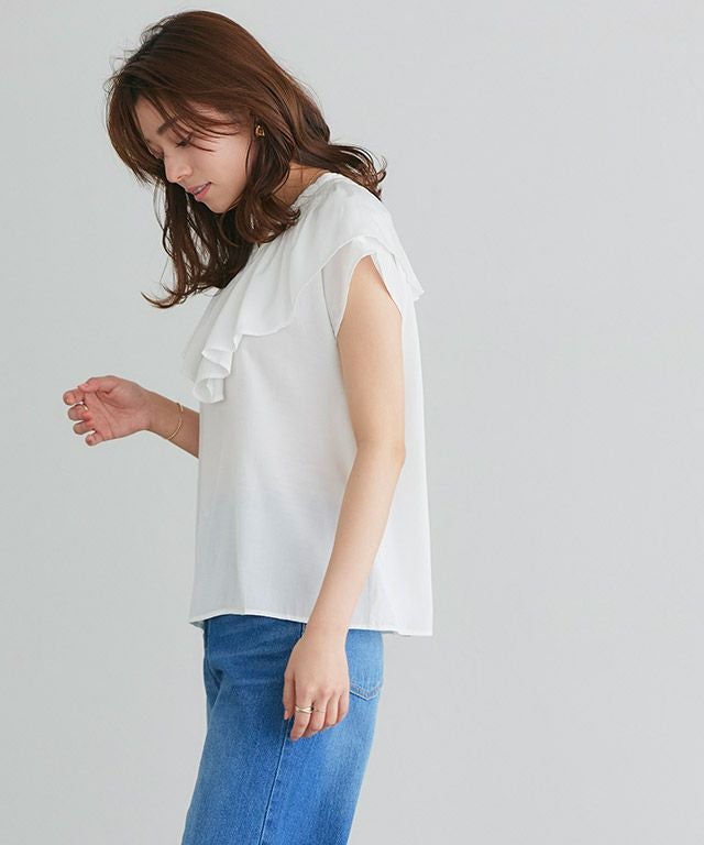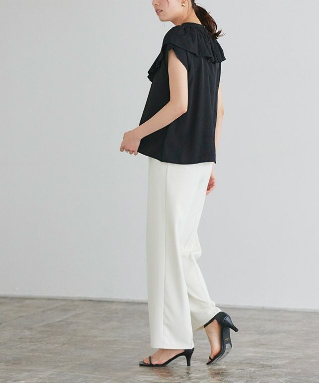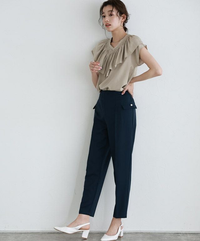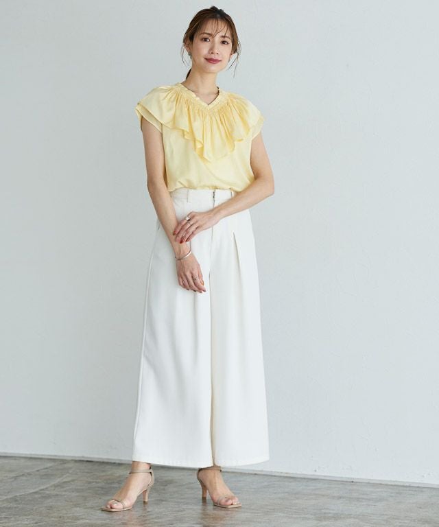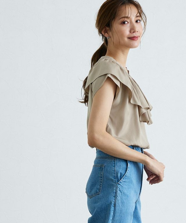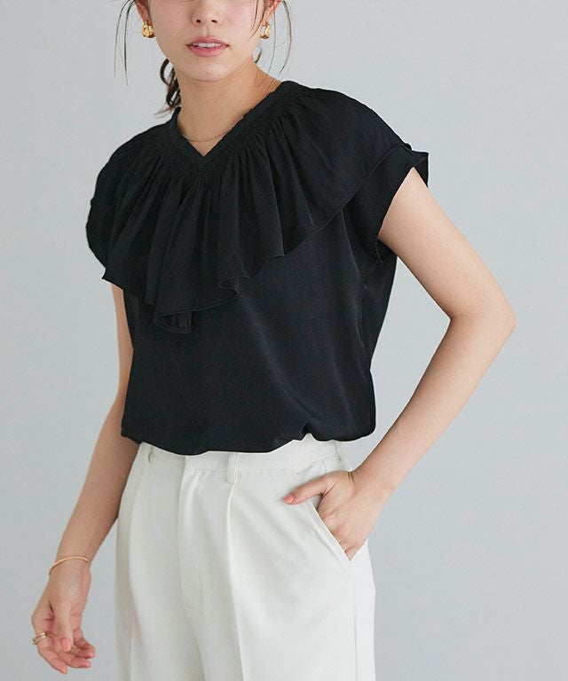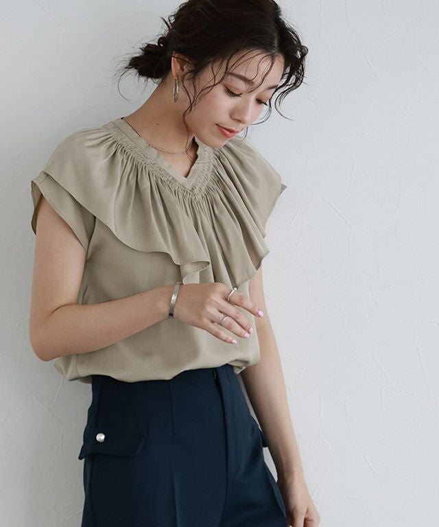着るだけで華やかな印象をプラス“シャーリングフリルカラーブラウス”