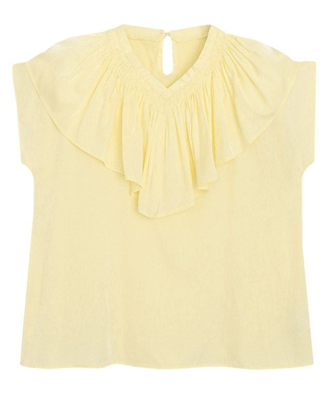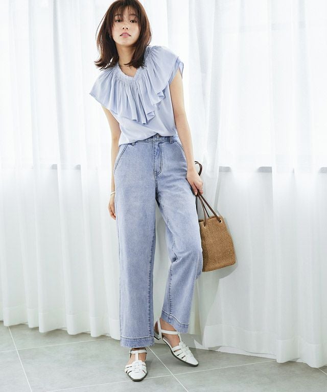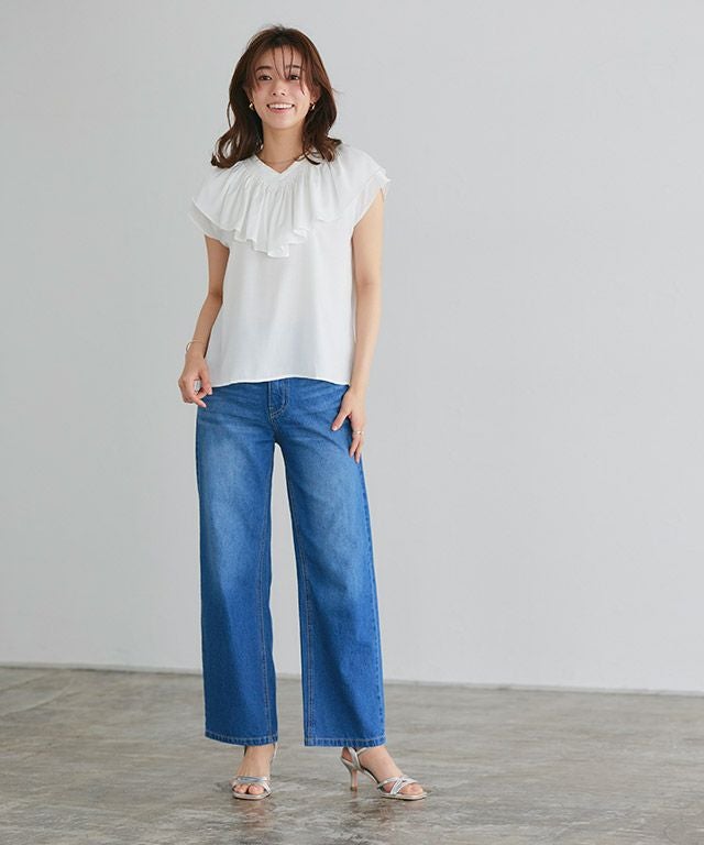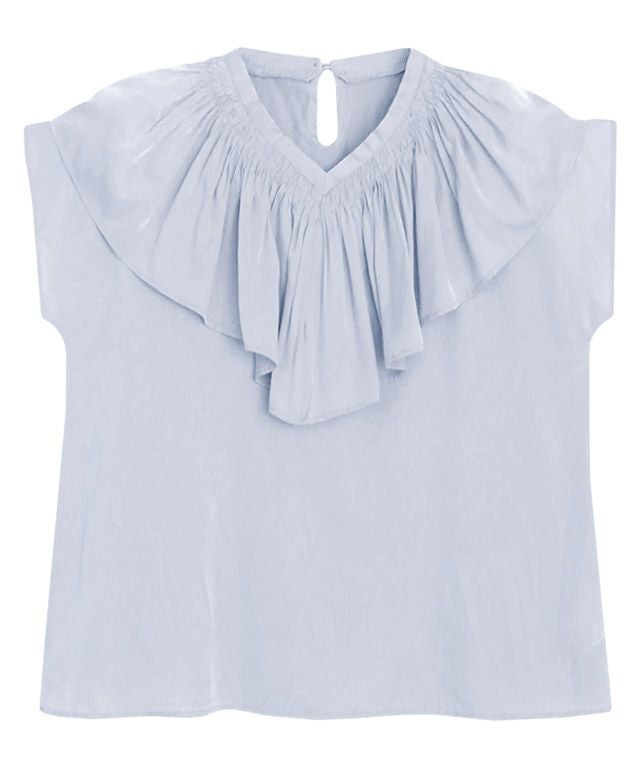 顔周りを華やかな印象に導いてくれるフリルカラーデザイン。フリルには繊細なシャーリングを施し、こだわりの詰まった一枚です。程良く開いたVネックラインがフェミニンなデザインの中にもすっきりとした印象をプラスしてくれます。