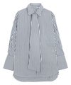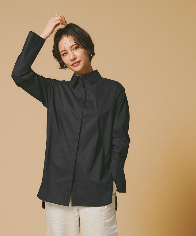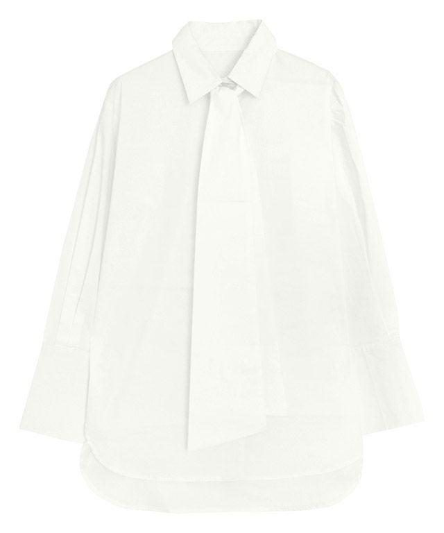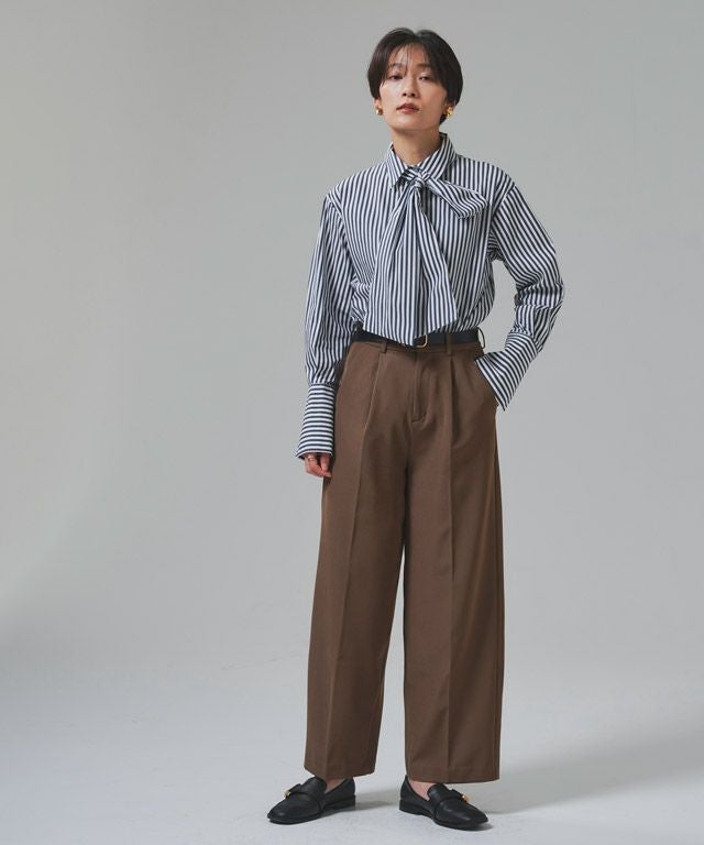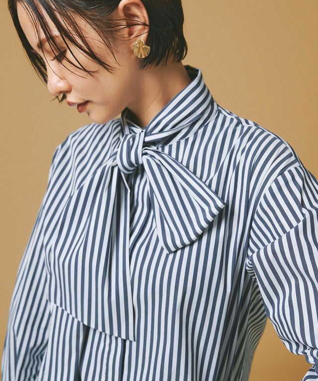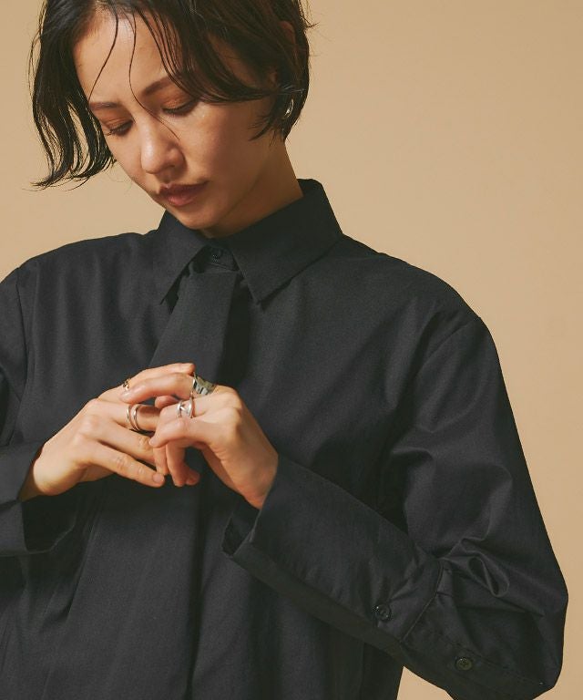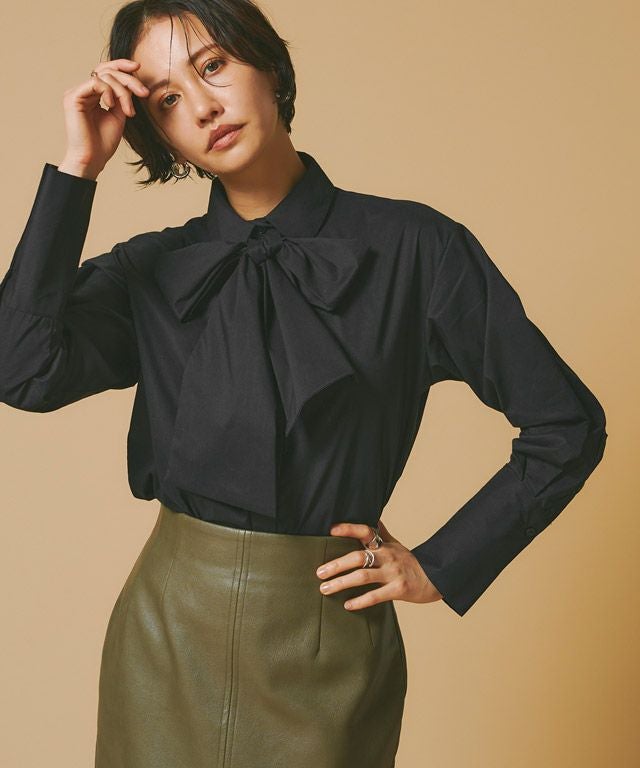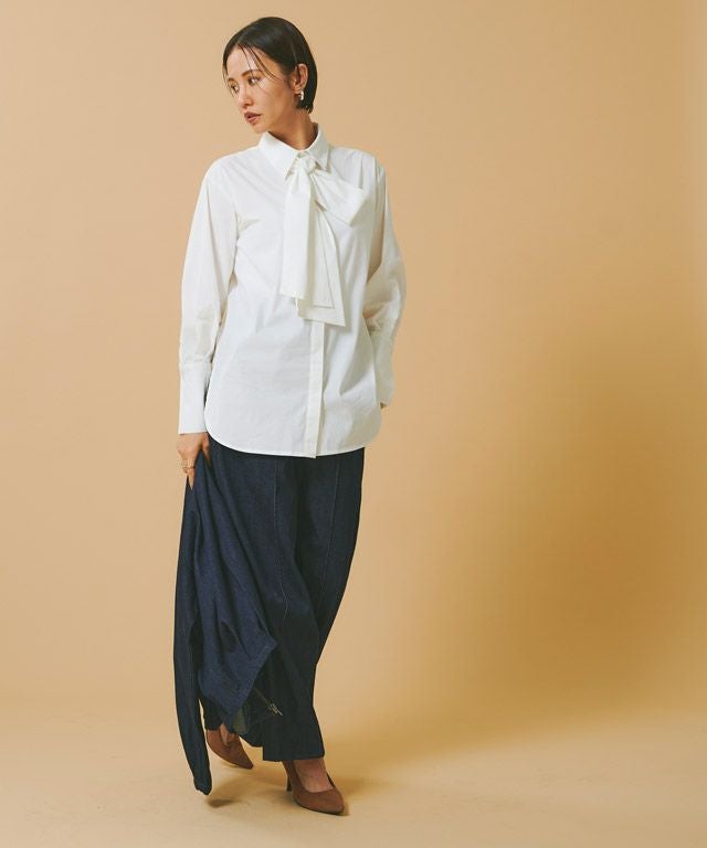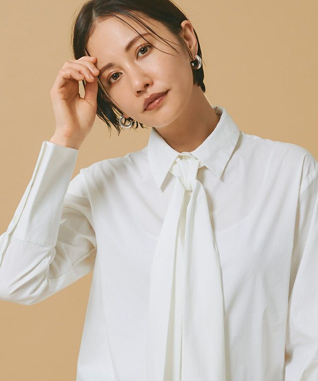 一見シンプルでベーシックなシャツに、クラシカルなロングカフスがアクセントを加えています。取り外し可能なボウタイは、インパクトのあるワイドデザインで顔周りを華やかに見せてくれます。ニットやアウターとレイヤード出来るように身頃はすっきりと仕上げました。ハンサムなスタイルから女性らしいスタイルまで、幅広い着こなしに対応できるアイテムです。 ボウタイスタイルの時には、襟を内側に折り込むことで、ボウタイが邪魔にならずにすっきりと着用できます。
