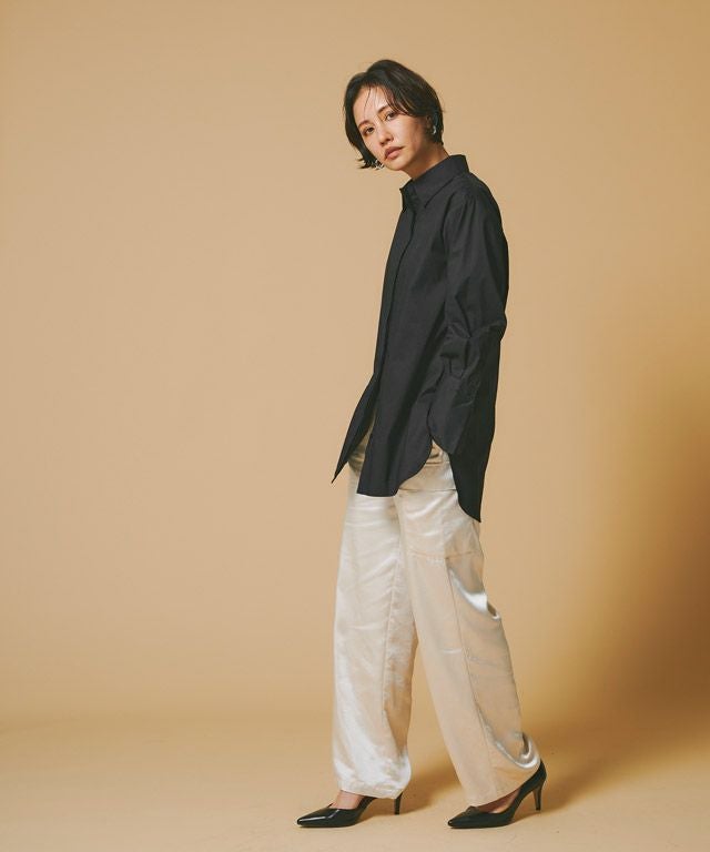 さらっとした表面感が特徴の綿混素材。滑らかな肌触りで着心地の良い素材感です。柔らかさと程よいハリ感を兼ね備え、綺麗なシルエットをキープします。