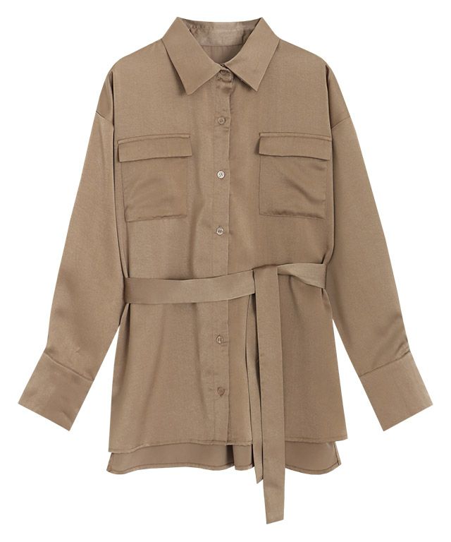 両胸元にあしらったポケットデザインがアクセントになる一枚。ややオーバーシルエットながらも、共地のリボンベルトでウエストマークすることでメリハリのある着こなしに仕上がります。長めの丈感が気になるヒップラインをしっかり隠してくれるところも嬉しいポイント。シャツとしてはもちろん、ボタンを外せば羽織りとしても活躍する万能アイテムです。
