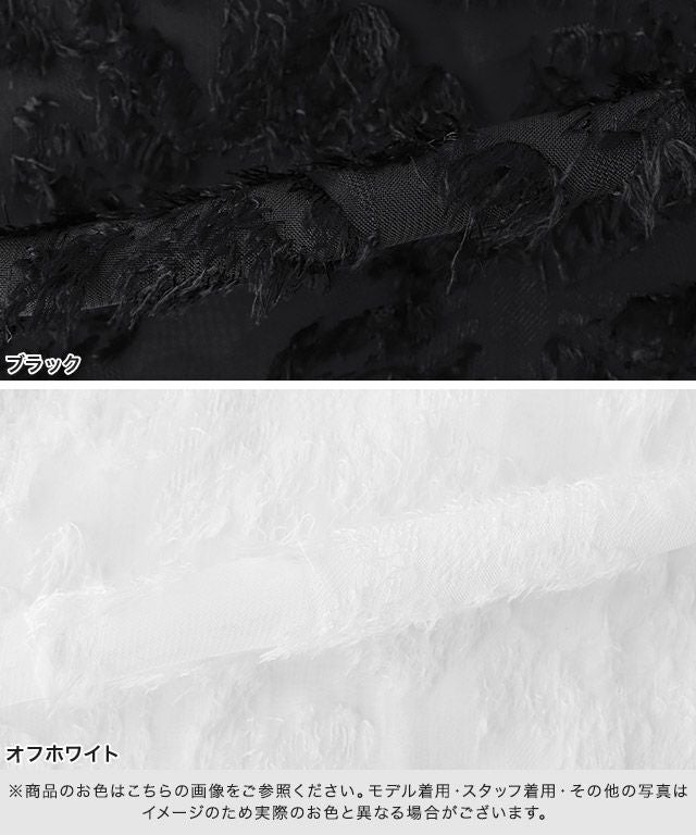 毛足のあるフラワージャカードが表情をプラスしてくれます。ベースはシアー感のある素材を使用しているので、抜け感のあるトレンドスタイルに◎