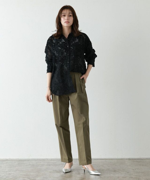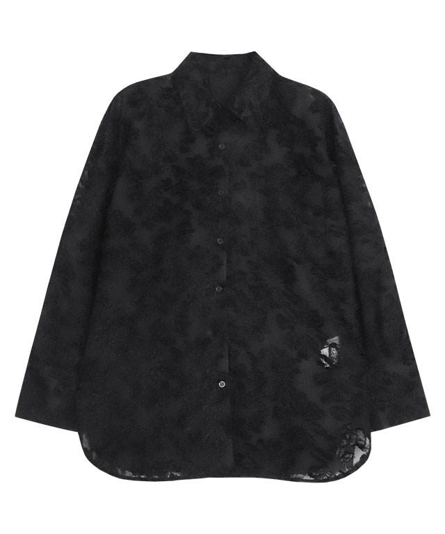 フェミニンな印象のジャカード素材を生かして、シャツデザインに落とし込んだ一枚。ハンサムなイメージのシャツも女性らしい印象で着こなせます。トップスとしてはもちろん、シアー素材なので夏場などの羽織りとしても◎