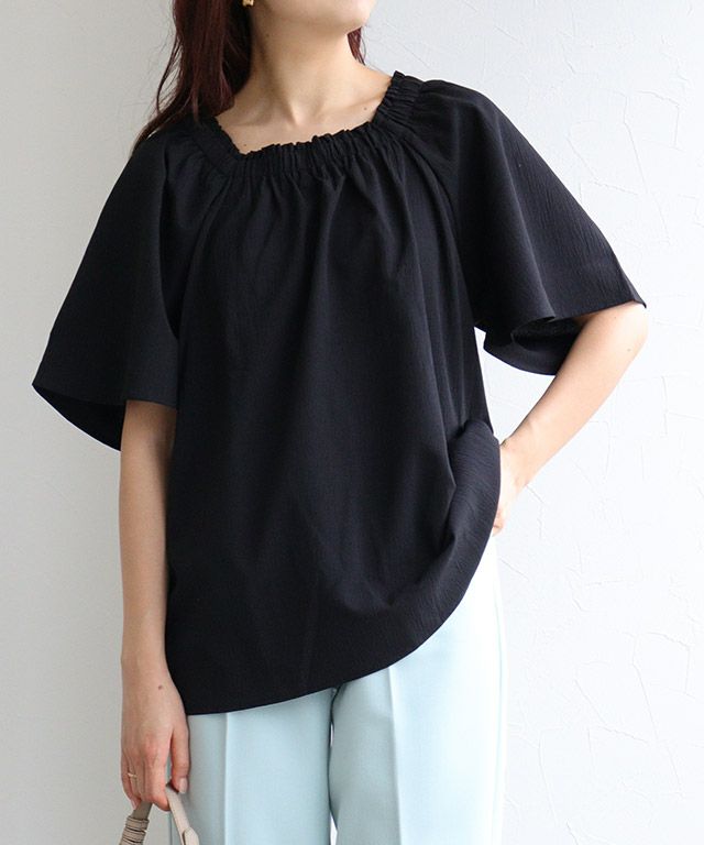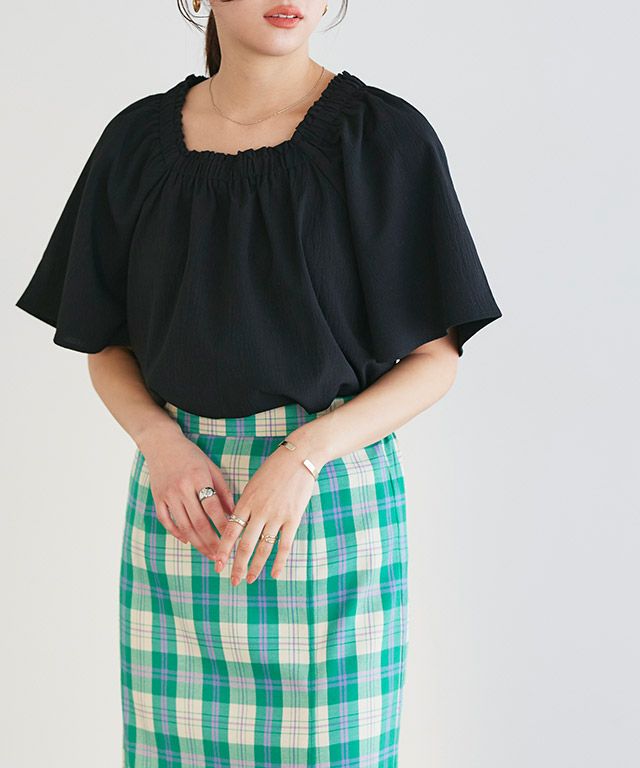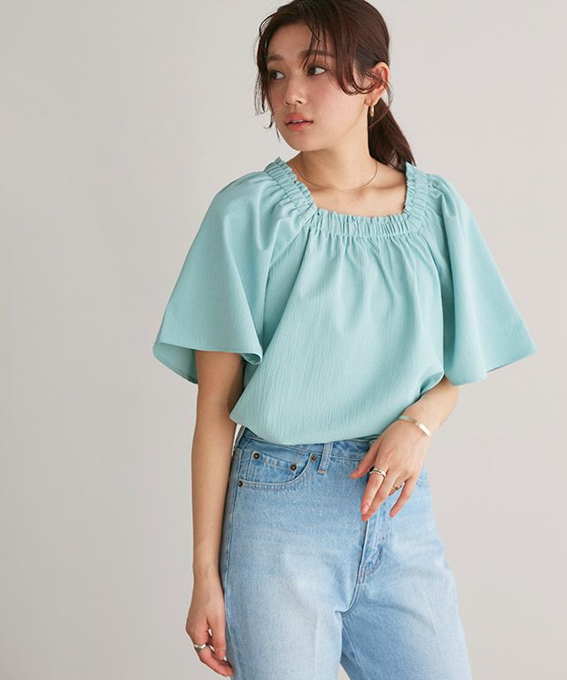 ラグランスリーブで丸みのあるデザインに仕上げた女性らしいアイテム。ネックラインはデコルテ周りがきれいに見えるスクエアネックとVネックで着用できる2way仕様に。袖はボリューム感を最大限まで活かせるラッフルフレアシルエットが大人フェミニンスタイルをつくります。