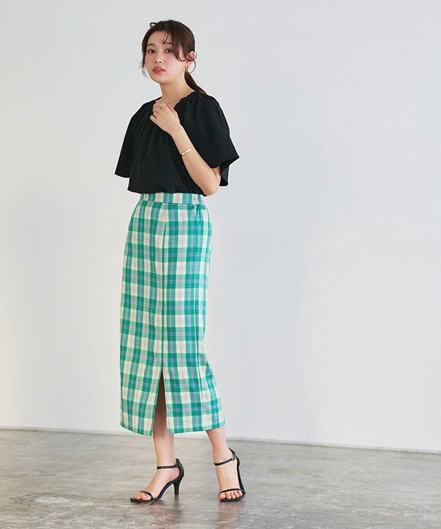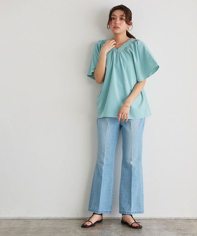 H 着丈はお尻がほとんど隠れる丈感でした。袖丈は肘上です。身幅は程よいゆとりがありました。さらっとした素材で袖がフレアになっているので二の腕もカバーできます。