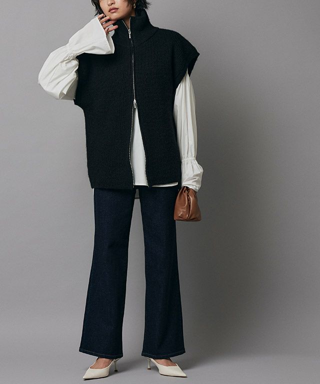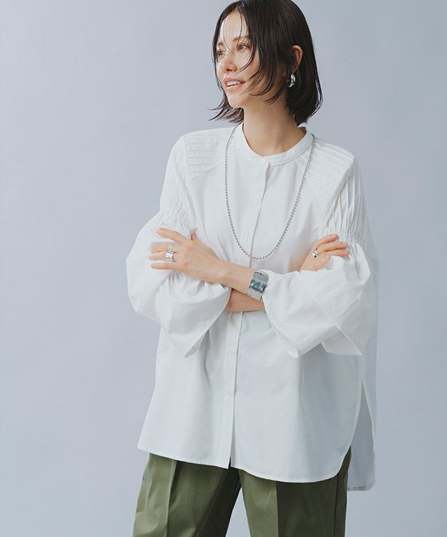 肩に施された繊細なピンタックがフェミニンなブラウスにシャープなアクセントをプラス。ボリュームたっぷりのキャンディスリーブが女性らしさ溢れるデザインです。襟元はバンドカラーでミニマルに仕上げました。