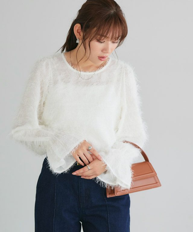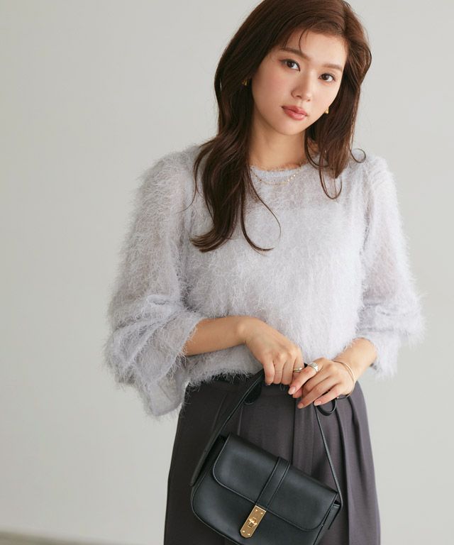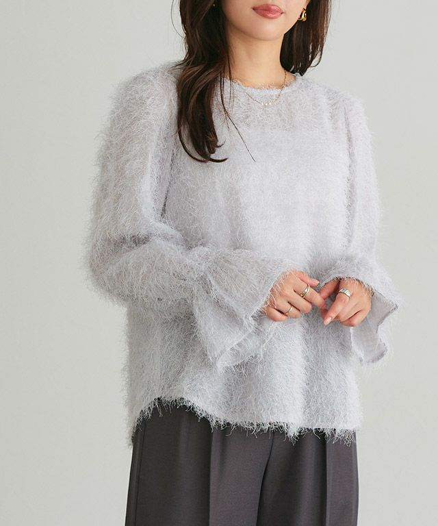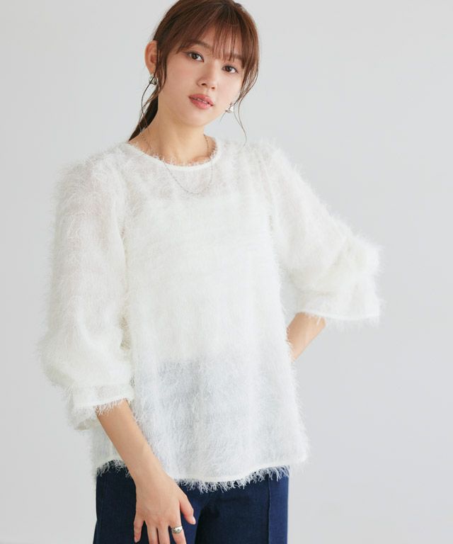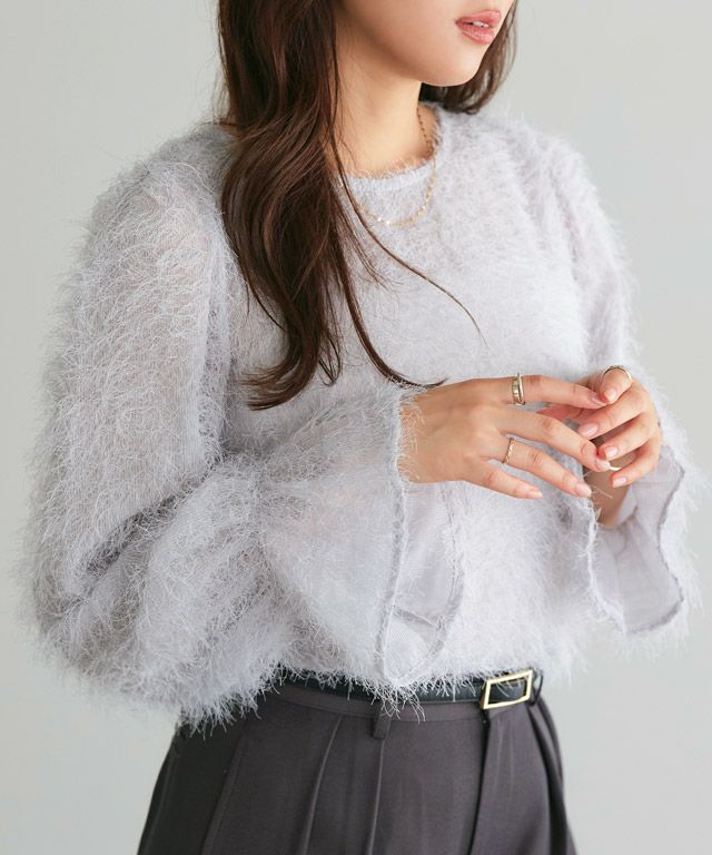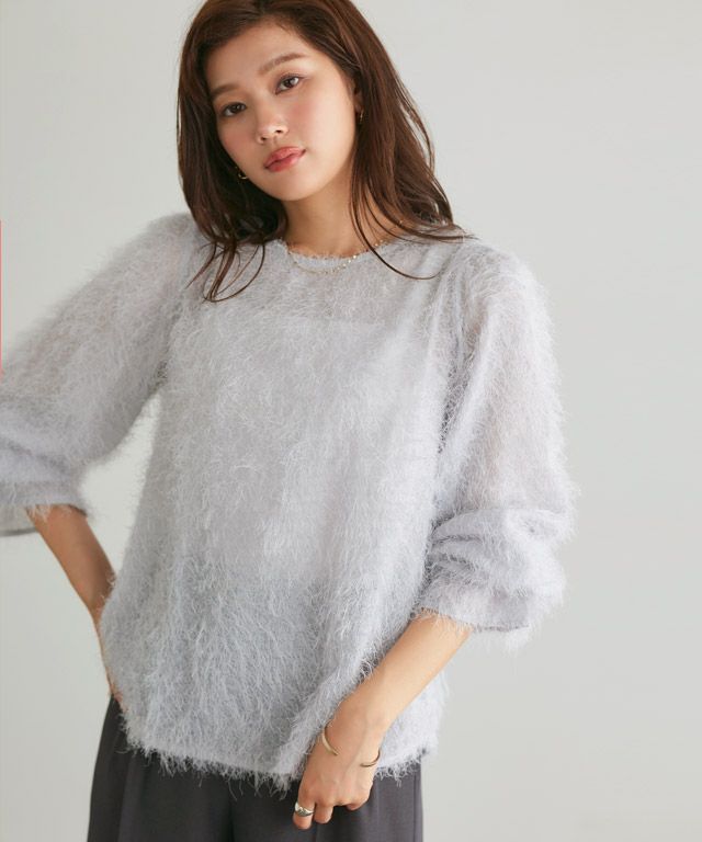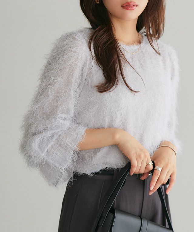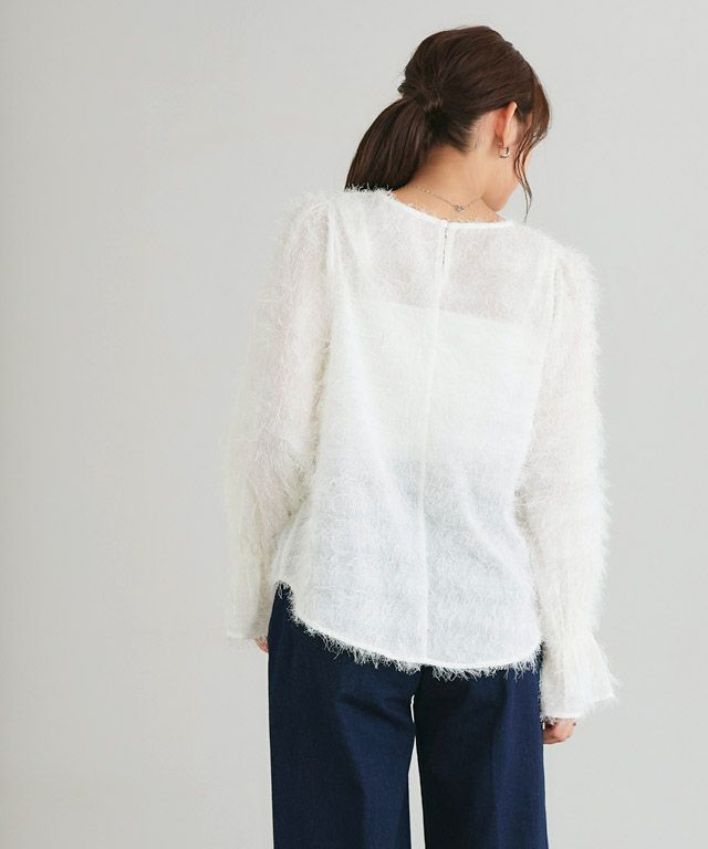 毛足の長いフェザーがラグジュアリーな印象のブラウス。透け感のある軽い素材ですがシーズンムードをプラスしてくれ、ふんわりとした質感で華やかなアクセントに。