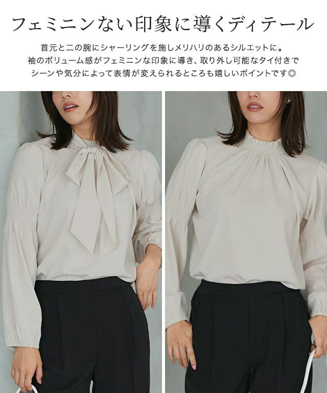 首元と二の腕にシャーリングを施しメリハリのあるシルエットに。袖のボリューム感がフェミニンな印象に導き、取り外し可能なタイ付きでシーンや気分によって表情が変えられるところも嬉しいポイントです◎