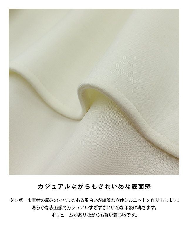 ダンボール素材の厚みのとハリのある風合いが綺麗な立体シルエットを作り出します。滑らかな表面感でカジュアルすぎずきれいめな印象に導きます。ボリュームがありながらも軽い着心地です。