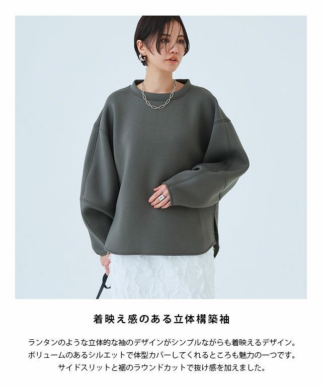 ランタンのような立体的な袖のデザインがシンプルながらも着映えるデザイン。ボリュームのあるシルエットで体型カバーしてくれるところも魅力の一つです。サイドスリットと裾のラウンドカットで抜け感を加えました。