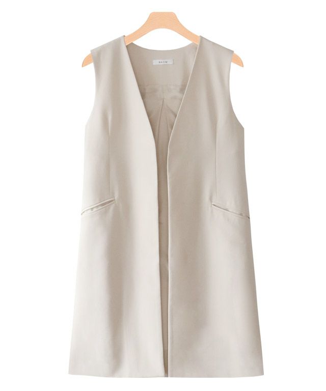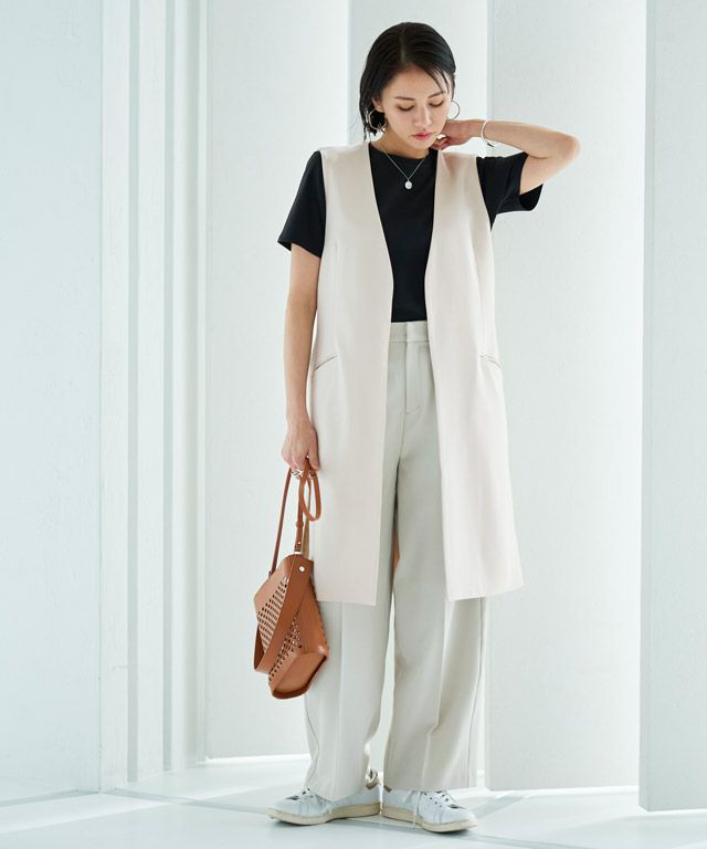 すっきりとしたノーカラーとサイドスリットで抜け感のあるロングジレ。すとんとしたIラインと長めの丈感でこなれた印象に。ボタンの無いトッパータイプなので、どんなアイテムともさらっと合わせやすいところも魅力の一つです。バックにはボックスタックを施し、歩くたび動きのあるシルエットに仕上げました。
