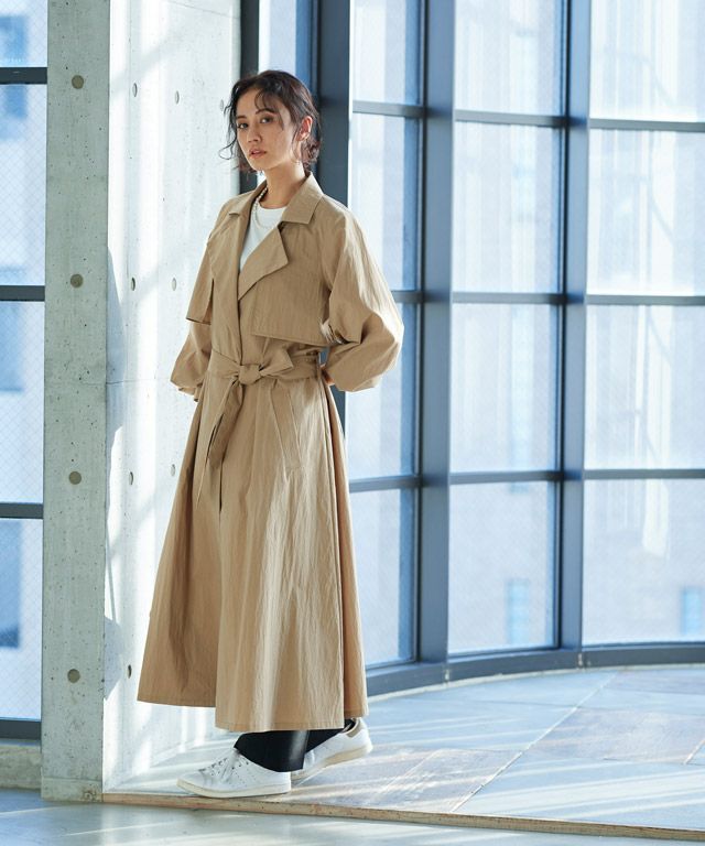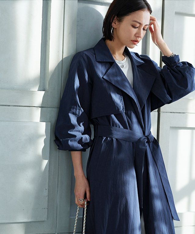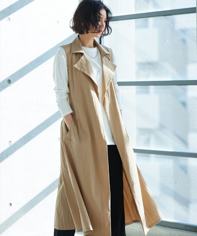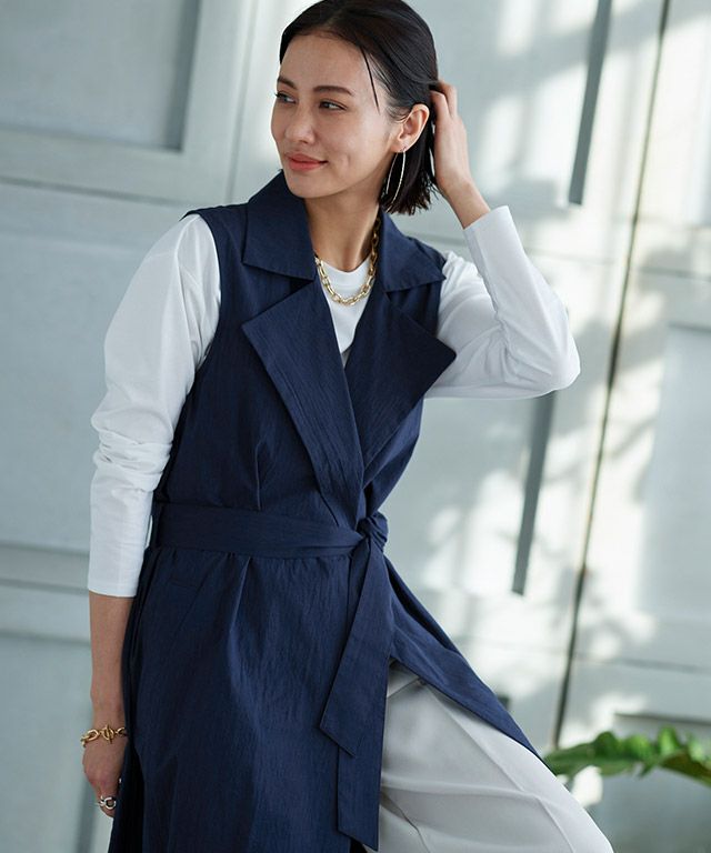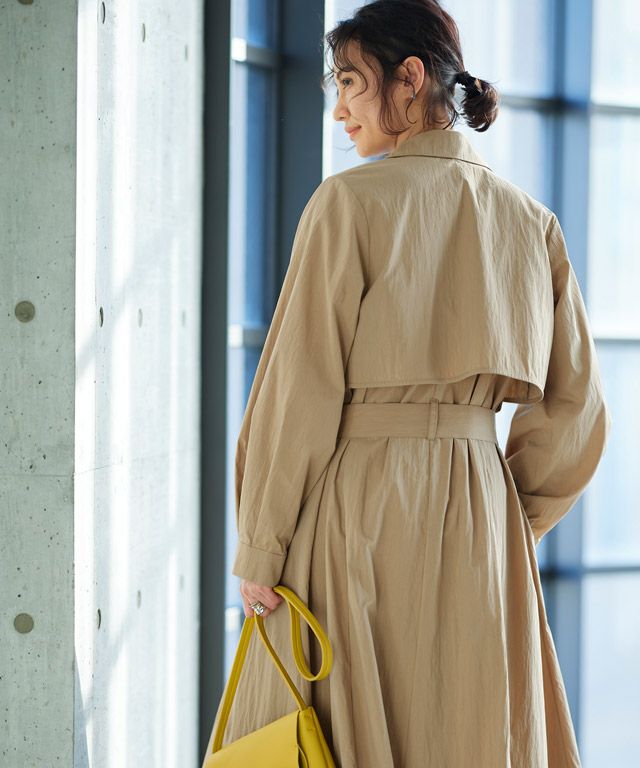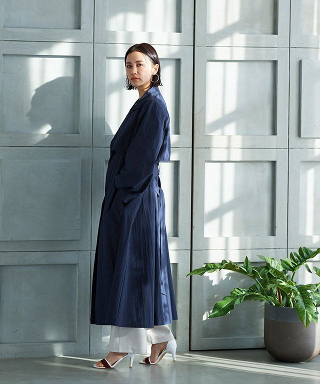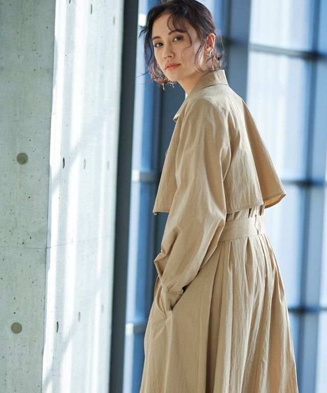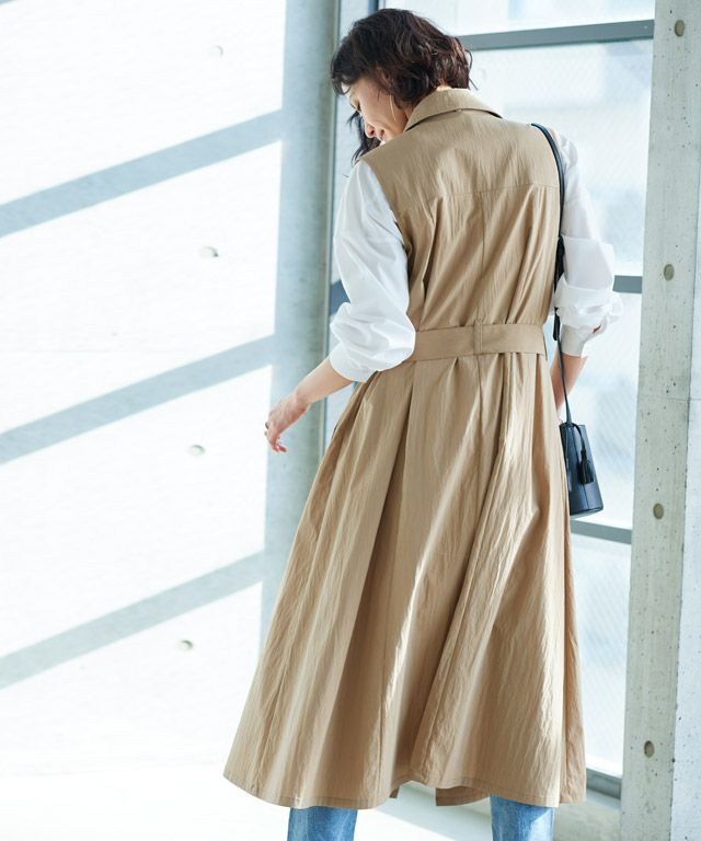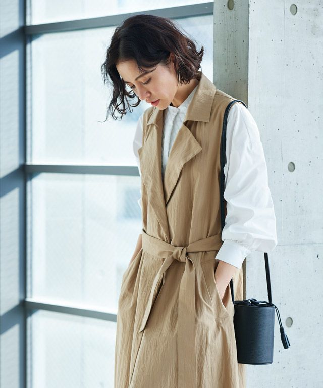 トレンチコートとしても、ジレとしても着用できる2way仕様。足元まであるロング丈と、たっぷりとボリュームを持たせたシルエットがこなれた印象に導きます。トッパータイプなのでさらっと羽織るだけでサマになる一枚です。付属のベルトでウエストマークができ、様々な着こなしができるところもポイントです。