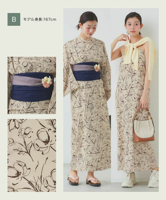 ワンピース型で洋服感覚で簡単に着られる新感覚な一枚。浴衣としてはもちろん、ワンピース単体で着られるところが魅力。浴衣としての着用とまた違った印象で普段着としても着回せます。